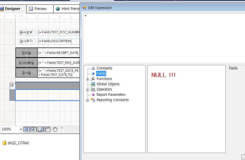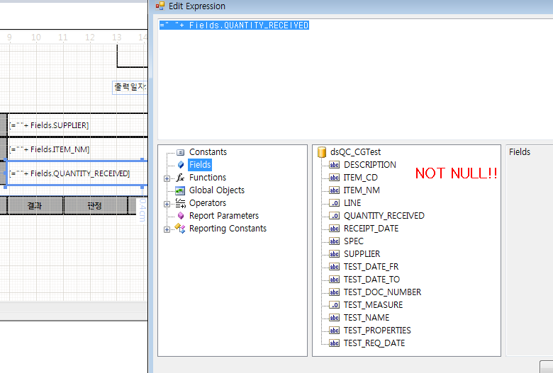 The detailselection.png shows that you are positioned in the context of a different Data Item - a Table or a List item. Data Items have their own data source and data context. Set the Table/List.DataSource in order to see the fields in the Edit Expression window.