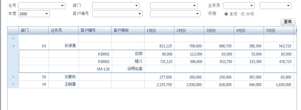 using System;using System.Collections.Generic;using System.Linq;using System.Web;using System.Web.UI;using System.Web.UI.WebControls;using Control.UserRequest;using Control.Global;using Control.Position_C;using Control.Salesman_C;using Control.Depart_C;using Model;using Telerik.Web.UI;using Control.Bill_C;namespace ERP.SalesAnalysis{ public partial class BillByCustMonth : Is_Login { private UserRequestController urc = null; IList<Cust> custList = null; IList<Dept> departList = null; IList<Salesman> salesList = null; static string digit = ""; protected void Page_Load(object sender, EventArgs e) { if (!Page.IsPostBack) { urc = GlobalUserController.get_login_user_request_controller(Session["userID"].ToString()); string permitString = urc.getBillByCustMonthPermit(); LoadPosition(); LoadCustomerComboBox(urc); LoadDepartment(); LoadSalesman(); setPermit(permitString, urc); YearComboBox.SelectedValue = DateTime.Now.Year.ToString(); decimal p = SystemParamController.param.amt_point; //decimal p = 2; for test digit = ""; for (decimal i = 0; i < p; i++) { digit += "0"; } if (digit != "") { digit = "{0:#,#." + digit + "}"; } else { digit = "{0:#,#}"; } } } private void LoadSalesman() { salesList = SalesmanController.getAllSalesmanList(); if (salesList.Count != 0) for (int i = 0; i < salesList.Count; i++) { SalesmanComboBox1.Items.Add(new RadComboBoxItem(salesList[i].salesmanId.deptcode + "\t" + salesList[i].salesmanId.name, salesList[i].salesmanId.name)); SalesmanComboBox2.Items.Add(new RadComboBoxItem(salesList[i].salesmanId.deptcode + "\t" + salesList[i].salesmanId.name, salesList[i].salesmanId.name)); } SalesmanComboBox1.ClearSelection(); SalesmanComboBox2.ClearSelection(); } private void LoadDepartment() { departList = DepartController.getDepartList(); DepartComboBox1.DataSource = departList; DepartComboBox1.DataTextField = "deptcode"; DepartComboBox1.DataValueField = "deptcode"; DepartComboBox1.DataBind(); DepartComboBox2.DataSource = departList; DepartComboBox2.DataTextField = "deptcode"; DepartComboBox2.DataValueField = "deptcode"; DepartComboBox2.DataBind(); } private void setPermit(string permitString, UserRequestController urc) { } protected void LoadPosition() { PositionComboBox.DataSource = PositionController.getPositionList(); PositionComboBox.DataTextField = "p_code"; PositionComboBox.DataValueField = "p_code"; PositionComboBox.DataBind(); } protected void LoadCustomerComboBox(UserRequestController urc) { custList = urc.getCustomerListByUser(); CustomerComboBox1.HighlightTemplatedItems = true; CustomerComboBox1.DataSource = custList; CustomerComboBox1.DataTextField = "c_code"; CustomerComboBox1.DataValueField = "c_code"; CustomerComboBox1.DataBind(); CustomerComboBox2.HighlightTemplatedItems = true; CustomerComboBox2.DataSource = custList; CustomerComboBox2.DataTextField = "c_code"; CustomerComboBox2.DataValueField = "c_code"; CustomerComboBox2.DataBind(); } protected void BillGrid_PreRender(object sender, System.EventArgs e) { setFormat(); } protected void setFormat() { string format = digit; if (!StandardCurrency.Checked) { format = "{0:#,#.00}"; } foreach (GridColumn column in BillGrid.Columns) { if (column.UniqueName == "Sales1" || column.UniqueName == "Sales2" || column.UniqueName == "Sales3" || column.UniqueName == "Sales4" || column.UniqueName == "Sales5" || column.UniqueName == "Sales6" || column.UniqueName == "Sales7" || column.UniqueName == "Sales8" || column.UniqueName == "Sales9" || column.UniqueName == "Sales10" || column.UniqueName == "Sales11" || column.UniqueName == "Sales12") { (column as GridBoundColumn).DataFormatString = format; } else if (column.UniqueName == "Sum" || column.UniqueName == "Avg") { (column as GridCalculatedColumn).DataFormatString = format; } } BillGrid.Rebind(); } protected void BillGrid_NeedDataSource(object source, GridNeedDataSourceEventArgs e) { if (!e.IsFromDetailTable) { string year = YearComboBox.SelectedValue; string position = PositionComboBox.SelectedValue; string startDept = DepartComboBox1.SelectedValue; string endDept = DepartComboBox2.SelectedValue; string startSales = SalesmanComboBox1.SelectedValue; string endSales = SalesmanComboBox2.SelectedValue; string startCust = CustomerComboBox1.SelectedValue; string endCust = CustomerComboBox2.SelectedValue; bool standard = true; if (!StandardCurrency.Checked) { standard = false; } BillGrid.DataSource = BillController.getBill(year, position, startDept, endDept, startSales, endSales, startCust, endCust, standard); } } protected void RadGrid1_DetailTableDataBind(object source, Telerik.Web.UI.GridDetailTableDataBindEventArgs e) { GridDataItem dataItem = (GridDataItem)e.DetailTableView.ParentItem; switch (e.DetailTableView.Name) { case "BillDetails": { string year = YearComboBox.SelectedValue; string position = PositionComboBox.SelectedValue; string startCust = CustomerComboBox1.SelectedValue; string endCust = CustomerComboBox2.SelectedValue; bool standard = true; if (!StandardCurrency.Checked) { standard = false; } string salesman = dataItem.GetDataKeyValue("Salesman").ToString(); e.DetailTableView.DataSource = BillController.getBillBySaleman(year, position, salesman, startCust, endCust,standard); //e.DetailTableView.Rebind(); break; } } } protected void SearchButton_Click(object sender, EventArgs e) { string year = YearComboBox.SelectedValue; string position = PositionComboBox.SelectedValue; string startDept = DepartComboBox1.SelectedValue; string endDept = DepartComboBox2.SelectedValue; string startSales = SalesmanComboBox1.SelectedValue; string endSales = SalesmanComboBox2.SelectedValue; string startCust = CustomerComboBox1.SelectedValue; string endCust = CustomerComboBox2.SelectedValue; bool standard = true; if (!StandardCurrency.Checked) { standard = false; } BillGrid.DataSource = BillController.getBill(year, position, startDept, endDept, startSales, endSales, startCust, endCust, standard); BillGrid.Rebind(); setFormat(); } }}<%@ Page Title="" Language="C#" MasterPageFile="~/Site.Master" 