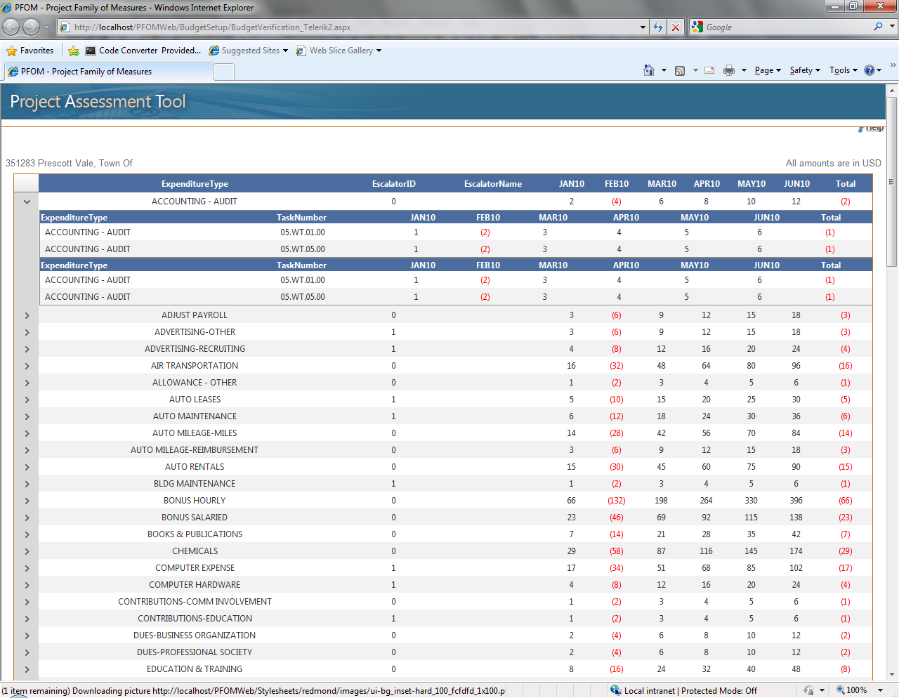 private void BindGrid() { RadGrid1.DataSource = _dsBudgetVerification.Tables["BVSummary"]; RadGrid1.Width = Unit.Percentage(98); RadGrid1.AutoGenerateColumns = false; RadGrid1.GridLines = GridLines.Both; //TODO: This doesn't seem to work RadGrid1.CssClass="gridborder"; RadGrid1.MasterTableView.DataKeyNames = new string[] { "ExpenditureType" }; RadGrid1.MasterTableView.Name = "tvSummary"; RadGrid1.MasterTableView.HierarchyLoadMode = GridChildLoadMode.ServerBind; //RadGrid1.MasterTableView.HierarchyLoadMode = GridChildLoadMode.Client; //RadGrid1.ClientSettings.AllowExpandCollapse = true; //Add Summary table RadGrid1.MasterTableView.Width = Unit.Percentage(100); GridBoundColumn boundColumn; GridDropDownColumn ddlColumn; foreach (DataColumn dataColumn in _dsBudgetVerification.Tables["BVSummary"].Columns) { //these apply to every column in Summary boundColumn = new GridBoundColumn(); RadGrid1.MasterTableView.Columns.Add(boundColumn); boundColumn.HeaderText = dataColumn.Caption; boundColumn.HeaderStyle.CssClass = "gridheader"; //we know the column names of the text fields, so let's set their formatting switch (dataColumn.Caption) { case "EscalatorID": case "EscalatorName": { //TODO: figure out how to add combobox here boundColumn.DataField = dataColumn.Caption; break; } case "ExpenditureType": case "ExpenditureTypeExists": { boundColumn.DataField = dataColumn.Caption; if (dataColumn.Caption == "ExpenditureTypeExists") boundColumn.Visible = false; break; } default: //anything else will be an amount { boundColumn.DataField = dataColumn.Caption; boundColumn.HeaderStyle.Width = 50; //also build our list of months for use in the Total column lstMonths += '"' + dataColumn.ColumnName + '"' + ','; break; } } } //now trim the last comma off the list lstMonths = lstMonths.Substring(1, lstMonths.Length - 3); //now add a calculated Total column at the end of the summary CreateCalcColumn(RadGrid1.MasterTableView, lstMonths); //Add Details table GridTableView tableViewDetails = new GridTableView(RadGrid1); RadGrid1.MasterTableView.DetailTables.Add(tableViewDetails); tableViewDetails.Width = Unit.Percentage(100); tableViewDetails.DataSource = _dsBudgetVerification.Tables["BVDetails"]; tableViewDetails.DataMember = "BVDetails"; tableViewDetails.DataKeyNames = new string[] { "ExpenditureType" }; tableViewDetails.Name = "tvDetails"; GridRelationFields relationFields = new GridRelationFields(); relationFields.MasterKeyField = "ExpenditureType"; relationFields.DetailKeyField = "ExpenditureType"; tableViewDetails.ParentTableRelation.Add(relationFields); RadGrid1.MasterTableView.DetailTables.Add(tableViewDetails); foreach (DataColumn dataColumn in _dsBudgetVerification.Tables["BVDetails"].Columns) { switch (dataColumn.Caption) { case "EscalatorID": case "EscalatorName": { //ddlColumn = new GridDropDownColumn(); //tableViewDetails.Columns.Add(ddlColumn); //ddlColumn.UniqueName = "Escalator"; //ddlColumn.ListTextField = "Escalator"; //ddlColumn.ListValueField = "EscalatorID"; //ddlColumn.ListDataMember = "Escalator"; //ddlColumn.DataSourceID = "dsrcEscalators"; //ddlColumn.DataField = dataColumn.Caption; //ddlColumn.HeaderText = dataColumn.Caption; //ddlColumn.HeaderStyle.CssClass = "gridheader"; //ddlColumn.EditItemTemplate = new ddlTemplate(); break; } default: { boundColumn = new GridBoundColumn(); tableViewDetails.Columns.Add(boundColumn); boundColumn.DataField = dataColumn.Caption; boundColumn.HeaderText = dataColumn.Caption; boundColumn.HeaderStyle.CssClass = "gridheader"; break; } } } //now add a calculated Total column at the end of the details CreateCalcColumn(tableViewDetails, lstMonths); } <telerik:RadAjaxManager ID="RadAjaxManager1" runat="server"> <AjaxSettings> <telerik:AjaxSetting AjaxControlID="RadGrid1"> <UpdatedControls> <telerik:AjaxUpdatedControl ControlID="RadGrid1" LoadingPanelID="RadAjaxLoadingPanel1" /> </UpdatedControls> </telerik:AjaxSetting> </AjaxSettings> </telerik:RadAjaxManager> <telerik:RadAjaxLoadingPanel ID="RadAjaxLoadingPanel1" runat="server"> </telerik:RadAjaxLoadingPanel> <telerik:RadGrid ID="RadGrid1" runat="server" OnItemDataBound="RadGrid1_ItemDataBound" />