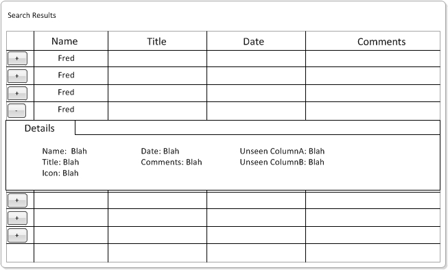 One of the challenges is that the design must be conditional. I'm using a "base" gridview for all search results, so some results will have heirarchial dataobjects, and other will be flat objects. I'll only be showing this detail row on certain flat object results.