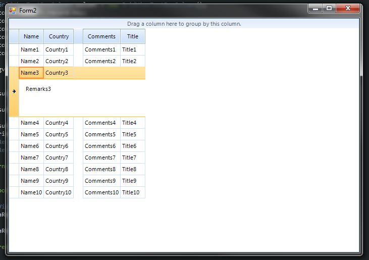 using System; using System.Collections.Generic; using System.ComponentModel; using System.Data; using System.Drawing; using System.Linq; using System.Text; using System.Windows.Forms; using Telerik.WinControls.UI; public partial class Form1 : Form { BindingList<Person> people = new BindingList<Person>(); BindingList<Child> children = new BindingList<Child>(); public Form1() { InitializeComponent(); // set defaults this.gridViewRowDetailsExtended1.ReadOnly = true; this.gridViewRowDetailsExtended1.ShowFilteringRow = false; this.gridViewRowDetailsExtended1.ShowGroupPanel = false; this.gridViewRowDetailsExtended1.AutoGenerateColumns = true; } private void ButtonPopulateHierarchy_Click(object sender, EventArgs e) { // reset grid this.gridViewRowDetailsExtended1.DataSource = null; PopulatePeople(); PopulateChildren(); // give a data source this.gridViewRowDetailsExtended1.DataSource = people; this.gridViewRowDetailsExtended1.Columns["Details"].IsVisible = true; // new: use row details false this.gridViewRowDetailsExtended1.UseRowDetails = false; this.gridViewRowDetailsExtended1.ShowRowDetails = false; this.gridViewRowDetailsExtended1.AutoSizeColumnsMode = Telerik.WinControls.UI.GridViewAutoSizeColumnsMode.Fill; // hierarchy stuff - the child template GridViewTemplate childTemplate = new GridViewTemplate(); childTemplate.DataSource = children; this.gridViewRowDetailsExtended1.MasterTemplate.Templates.Add(childTemplate); // set up a relation GridViewRelation relation = new GridViewRelation(this.gridViewRowDetailsExtended1.MasterTemplate, childTemplate); relation.RelationName = "ParentChildRelation"; relation.ParentColumnNames.Add("Id"); relation.ChildColumnNames.Add("ParentId"); this.gridViewRowDetailsExtended1.Relations.Add(relation); // best fit the columns foreach (GridViewDataColumn column in this.gridViewRowDetailsExtended1.Columns) { column.BestFit(); } } private void ButtonPopulateRowDetails_Click(object sender, EventArgs e) { // reset grid this.gridViewRowDetailsExtended1.Relations.Clear(); this.gridViewRowDetailsExtended1.Templates.Clear(); this.gridViewRowDetailsExtended1.DataSource = null; PopulatePeople(); // data source this.gridViewRowDetailsExtended1.DataSource = people; // new: use row details true this.gridViewRowDetailsExtended1.UseRowDetails = true; this.gridViewRowDetailsExtended1.Columns["Details"].IsVisible = false; // give it the row details column this.gridViewRowDetailsExtended1.DetailsColumn = this.gridViewRowDetailsExtended1.Columns["Details"]; // show the row details this.gridViewRowDetailsExtended1.ShowRowDetails = true; this.gridViewRowDetailsExtended1.EnableAllExpand = false; this.gridViewRowDetailsExtended1.AutoSizeColumnsMode = Telerik.WinControls.UI.GridViewAutoSizeColumnsMode.Fill; // so we can add html to the row details area this.gridViewRowDetailsExtended1.Columns["Details"].DisableHTMLRendering = false; // best fit the columns foreach (GridViewDataColumn column in this.gridViewRowDetailsExtended1.Columns) {column.BestFit();} } private void PopulatePeople() { people.Clear(); people.Add(new Person(1,"Richard", "Mr", DateTime.Now, "WinForms Developer", "Here are some details about Richard")); people.Add(new Person(2,"Chris", "Mr", DateTime.Now, "Operations Manager", "Here are some details about Chris")); people.Add(new Person(3,"Leisl", "Mrs", DateTime.Now, "Administative Assistant", "Here are some details about Leisl")); people.Add(new Person(4,"Chris", "Mr", DateTime.Now, "Cleaner", "Here are some details about Chris")); people.Add(new Person(5,"Peter", "Mr", DateTime.Now, "WinForms Developer", "Here are some details about Peter")); people.Add(new Person(6,"Ester", "Miss", DateTime.Now, "School Teacher", "Here are some details about Ester")); } private void PopulateChildren() { children.Clear(); children.Add(new Child(1, 1, "Javier")); children.Add(new Child(2, 2, "Jamie")); children.Add(new Child(3, 2, "Max")); children.Add(new Child(4, 5, "Zack")); } private void gridViewRowDetailsExtended1_CellFormatting(object sender, Telerik.WinControls.UI.CellFormattingEventArgs e) { // if it's a row details grid if (this.gridViewRowDetailsExtended1.Relations.Count == 0) { // and if its the current row and rowDetails column if (e.CellElement.RowInfo.IsCurrent && e.CellElement.ColumnInfo == this.gridViewRowDetailsExtended1.DetailsColumn) { // set some html and style e.CellElement.DrawFill = true; e.CellElement.GradientStyle = Telerik.WinControls.GradientStyles.Solid; e.CellElement.BackColor = Color.LightBlue; e.CellElement.Padding = new Padding(10); e.CellElement.Text = "<html>" + e.CellElement.Text.Replace("Here", "<strong>Here</strong>") + "</html>"; } else { // otherwise reset for UI Virtualization e.CellElement.ResetValue(LightVisualElement.DrawFillProperty, Telerik.WinControls.ValueResetFlags.Local); e.CellElement.ResetValue(LightVisualElement.GradientStyleProperty, Telerik.WinControls.ValueResetFlags.Local); e.CellElement.ResetValue(LightVisualElement.BackColorProperty, Telerik.WinControls.ValueResetFlags.Local); e.CellElement.ResetValue(LightVisualElement.PaddingProperty, Telerik.WinControls.ValueResetFlags.Local); } } } } /// <summary> /// Note: Currently, whatever you use for Row Details /// cannot be the last column. In this case "Details" is one but last /// </summary> public class Person { public Person(int id, string name, string title, DateTime date, string comments, string details) { this.Id = id; this.Name = name; this.Title = title; this.Date = date; this.Comments = comments; this.Details = details; } public int Id { get; set; } public string Name {get; set;} public string Title {get; set;} public DateTime Date {get; set;} public string Details { get; set; } public string Comments {get; set;} } public class Child { public Child(int id, int parentId, string name) { this.Id = id; this.ParentId = parentId; this.Name = name; } public int Id { get; set; } public int ParentId { get; set; } public string Name { get; set; } } And if you've downloaded my code li