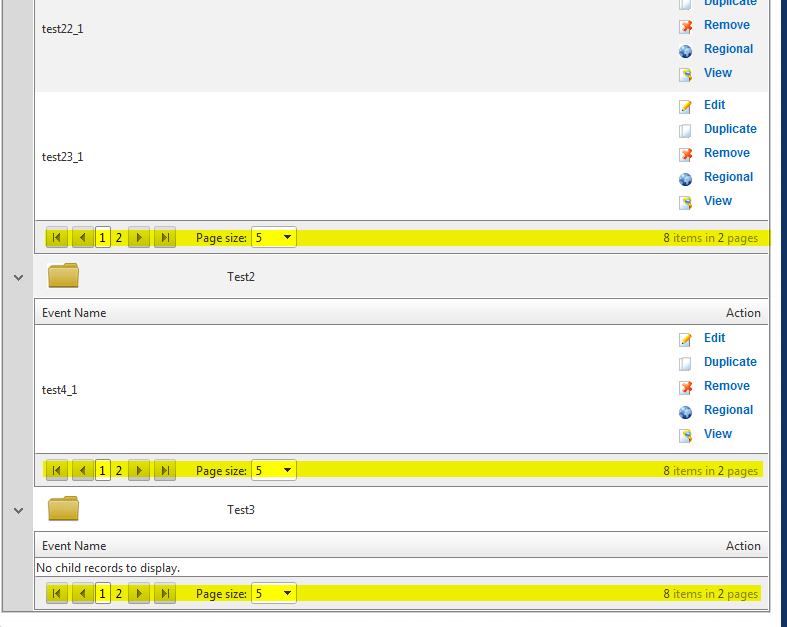 <telerik:RadGrid ID="radGridFolders" runat="server" AutoGenerateColumns="False" AllowSorting="True" GridLines="None" ShowGroupPanel="False" OnDetailTableDataBind="RadGridFoldersDetailTableDataBind" OnNeedDataSource="RadGridFoldersNeedDataSource" OnItemCreated="RadGridFoldersItemCreated" AllowPaging="True" PageSize="5"> <MasterTableView DataKeyNames="EventFolderId"> <DetailTables> <telerik:GridTableView AutoGenerateColumns="false" DataKeyNames="EventId" Width="100%"> <ParentTableRelation> <telerik:GridRelationFields DetailKeyField="EventFolderId" MasterKeyField="EventFolderId" /> </ParentTableRelation> <Columns> <telerik:GridBoundColumn SortExpression="EventName" HeaderText="Event Name" DataField="EventName" UniqueName="EventName"> </telerik:GridBoundColumn> <telerik:GridTemplateColumn UniqueName="Action" HeaderText="Action" HeaderStyle-HorizontalAlign="Right"> <ItemTemplate> <ul class="actions"> <li> <telerik:RadButton ID="radBtnEventEdit" runat="server" Text="Edit" ButtonType="LinkButton" ForeColor="#0067be" CausesValidation="False" BorderStyle="None"> <Icon PrimaryIconUrl="../images/img_rename.gif" /> </telerik:RadButton> </li> <li> <telerik:RadButton ID="radBtnEventDuplicate" runat="server" Text="Duplicate" ButtonType="LinkButton" ForeColor="#0067be" CausesValidation="False" BorderStyle="None"> <Icon PrimaryIconUrl="../images/img_duplicate.gif" /> </telerik:RadButton> </li> <li> <telerik:RadButton ID="radBtnEventRemove" runat="server" Text="Remove" ButtonType="LinkButton" ForeColor="#0067be" CausesValidation="False" BorderStyle="None"> <Icon PrimaryIconUrl="../images/img_remove.gif" /> </telerik:RadButton> </li> <li> <telerik:RadButton ID="radBtnEventRegional" runat="server" Text="Regional" ButtonType="LinkButton" ForeColor="#0067be" CausesValidation="False" BorderStyle="None"> <Icon PrimaryIconUrl="../images/img_regional.gif" /> </telerik:RadButton> </li> <li> <telerik:RadButton ID="radBtnEventView" runat="server" Text="View" ButtonType="LinkButton" ForeColor="#0067be" CausesValidation="False" BorderStyle="None"> <Icon PrimaryIconUrl="../images/img_view.gif" /> </telerik:RadButton> </li> </ul> </ItemTemplate> </telerik:GridTemplateColumn> </Columns> </telerik:GridTableView> </DetailTables> <Columns> <telerik:GridTemplateColumn HeaderText="Event Folder" DataField="EventFolder" UniqueName="EventFolder"> <ItemTemplate> <table cellspacing="0" width="100%"> <tr> <td style="width: 25%"> <img src="../images/img_folder_closed.gif" border="0" alt="<%# Eval("EventFolder") %>" /> </td> <td style="width: 75%"> <%# Eval("EventFolder")%> </td> </tr> </table> </ItemTemplate> </telerik:GridTemplateColumn> </Columns> </MasterTableView></telerik:RadGrid>And one more question: is it possible to collapse one row when another is expanding?