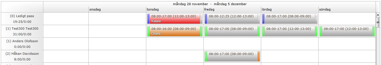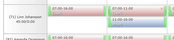 public class CustomDragDropBehavior : ScheduleViewDragDropBehavior { public event EventHandler<EventArgs<TimeScheduleShift>> NewShiftDropped; public override void Drop(DragDropState state) { if (state.IsControlPressed) { // TODO: Copy shift } if (state.SourceAppointmentsSource == state.DestinationAppointmentsSource) { if (state.Appointment != null && state.DestinationSlots.Count() > 0) { // Get dragged shift TimeScheduleShift shift = state.Appointment as TimeScheduleShift; if (shift != null) { // Get destionation slot (where shift is dropped) DragDropSlot slot = state.DestinationSlots.First() as DragDropSlot; if (slot != null && slot.Resources.Count() > 0) { // Get destination slot's employee TimeScheduleEmployeeResource employee = slot.Resources.First() as TimeScheduleEmployeeResource; if (employee != null) { // Check if destination employee is different from source employee int employeeId = 0; Int32.TryParse(employee.ResourceName, out employeeId); if (employeeId != 0 && employeeId != shift.EmployeeId) shift.EmployeeId = employeeId; } } } } base.Drop(state); } else { // Get dropped shift var newShift = state.Appointment as TimeScheduleShift; // Get time slot where shift was dropped Slot droppedAtSlot = state.DestinationSlots.First(); // Calculate offset between default shift start and actual dropped at start TimeSpan offset = droppedAtSlot.Start - newShift.Start; // Set new times based on dropped time newShift.Start = newShift.Start.Add(offset); if (newShift.BreakStart.HasValue) newShift.BreakStart = newShift.BreakStart.Value.Add(offset); if (newShift.BreakStop.HasValue) newShift.BreakStop = newShift.BreakStop.Value.Add(offset); newShift.End = newShift.End.Add(offset); newShift.ActualStart = newShift.Start; newShift.ActualEnd = newShift.End; // Add shift to collection (state.DestinationAppointmentsSource as ObservableCollection<TimeScheduleShift>).Add(newShift); if (NewShiftDropped != null) NewShiftDropped(this, new EventArgs<TimeScheduleShift>(newShift)); } } }In this code I can find out if I dropped the appointment on another resource (Employee) and change it's ID.