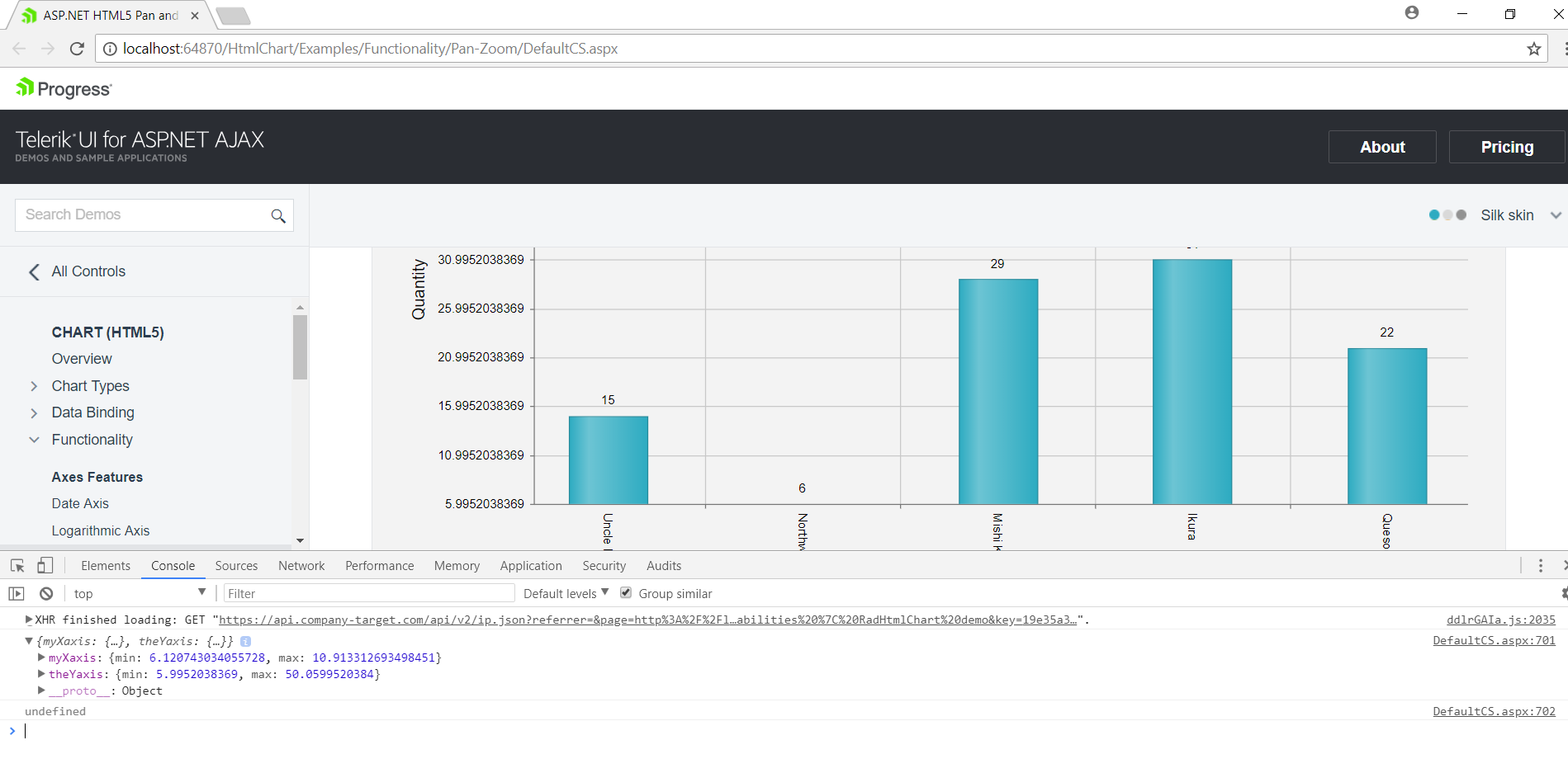 For example, if you modify the Pan and Zoom demo (https://demos.telerik.com/aspnet-ajax/htmlchart/examples/functionality/pan-zoom/defaultcs.aspx) as follows, you can get the axes ranges as shown in the screenshot below: