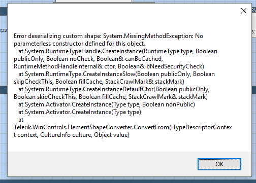According to the provided screenshot, it seems that you were missing parameterless constructor for your custom shapes. Indeed, creating such a constructor is the appropriate solution in this case. As a side note, you can refer to the following help article where you can find the relevant events when serializing/deserializing shapes: http://docs.telerik.com/devtools/winforms/diagram/events/diagram-events