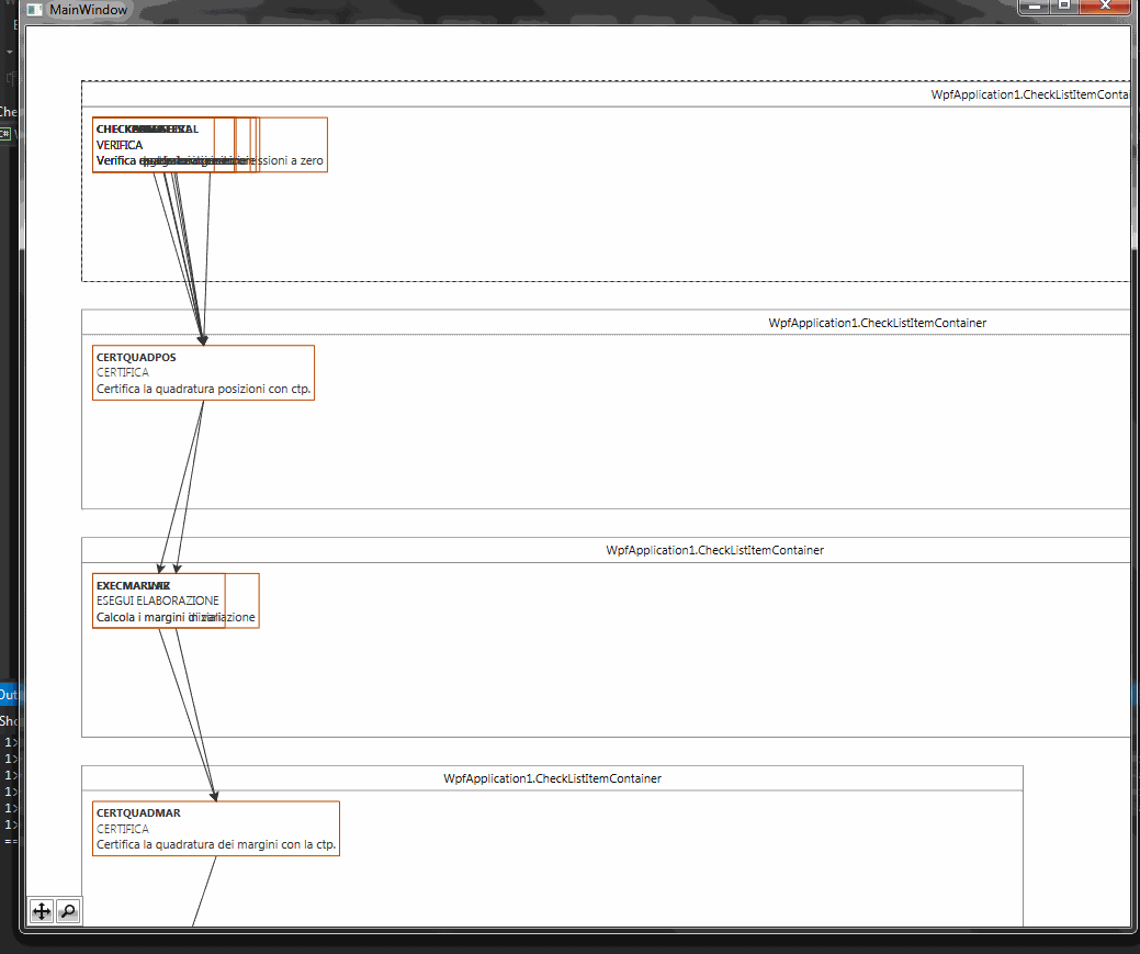 foreach (var level in levels) { CheckListItemContainer container = new CheckListItemContainer(); container.Content = "TEST"; foreach (var item in level) { if (!container.InternalItems.Any(x => x.ItemID == item.ItemID)) { var checklistItem = new CheckListItem(); checklistItem.ItemID = item.ItemID; checklistItem.Codice = item.Codice; checklistItem.Descrizione = item.Descrizione; checklistItem.Note = item.Note; checklistItem.Status = item.Status; checklistItem.Tipologia = item.Tipologia; checklistItem.TipologiaID = item.TipologiaID; container.AddItem(checklistItem); } Tmp[item.ItemID] = level.Key; } this.CheckListDiagramGraphSource.AddNode(container); }I've set in my view the TreeLayout as TreeLeft as (http://www.telerik.com/help/silverlight/media/raddiagram-features-layout-tree-left.png)