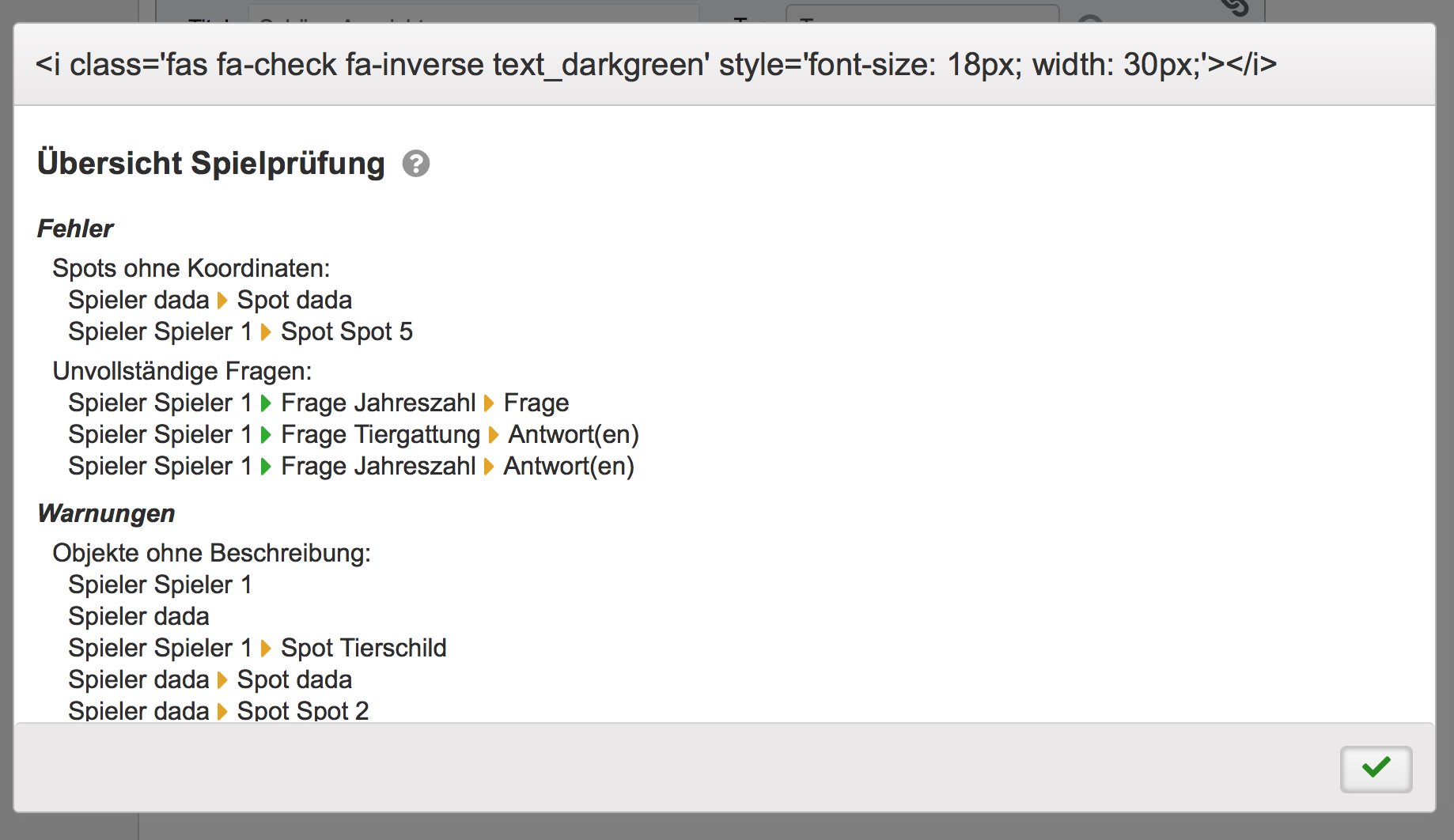 <!DOCTYPE html><html lang="en"> <head> <meta charset="UTF-8"> <!-- Telerik Framework --> <link rel="stylesheet" href="http://kendo.cdn.telerik.com/2018.1.221/styles/kendo.common.min.css" /> <link rel="stylesheet" href="http://kendo.cdn.telerik.com/2018.1.221/styles/kendo.blueopal.min.css" /> <script src="http://kendo.cdn.telerik.com/2018.1.221/js/jquery.min.js"></script> <script src="http://kendo.cdn.telerik.com/2018.1.221/js/kendo.all.min.js"></script> <!-- Font Awesome --> <script defer src="https://use.fontawesome.com/releases/v5.0.6/js/all.js"></script> <style type="text/css"> .green { color: #208e14; } </style> <script> $(document).ready(function() { $("#dialog").kendoDialog({ title: false, width: 900, height: 400, closable: false, buttonLayout: "normal", actions: [{ text: "<i class='fas fa-check green' style='font-size: 18px; width: 30px;'></i>", action: function(e){ // e.sender is a reference to the dialog widget object alert("OK action was clicked"); // Returning false will prevent the closing of the dialog return true; }, }] }); }); </script> </head> <body> <div id="dialog"></div> </body></html>
