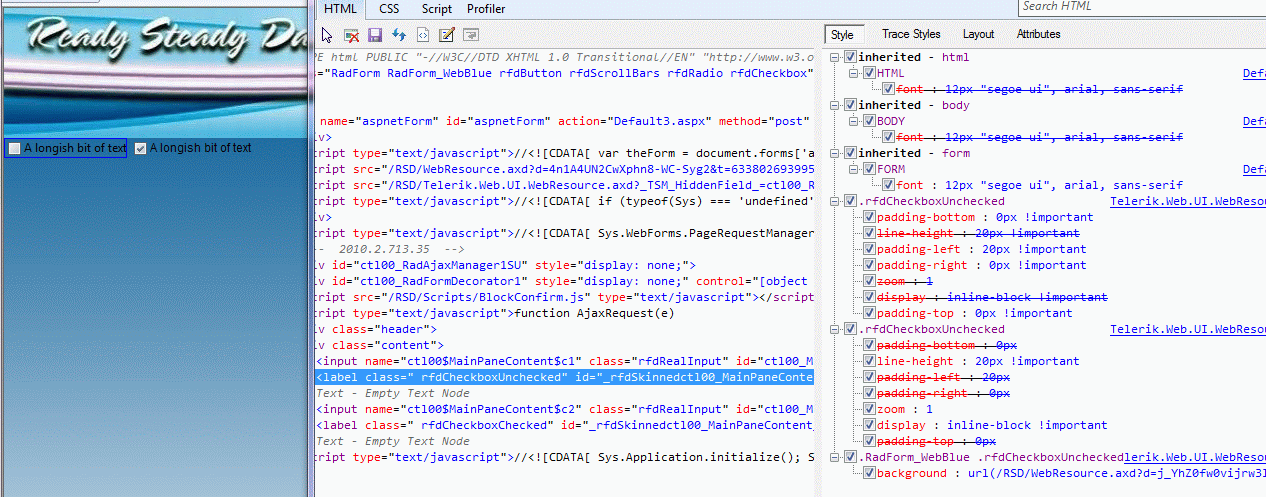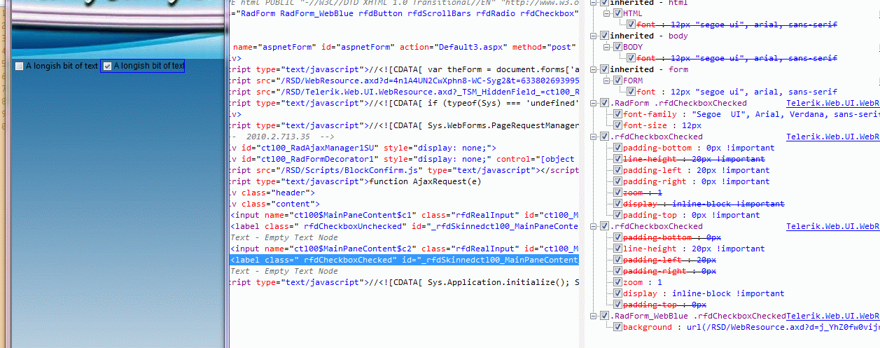 .RadForm.rfdTextbox input[type="text"], .RadForm.rfdTextbox input[type="password"], .RadForm.rfdTextarea textarea, .RadForm.rfdTextarea textarea[disabled]:hover, .RadForm.rfdTextbox input[disabled][type="text"]:hover, .RadForm.rfdTextbox input[disabled][type="password"]:hover, .RadForm .rfdCheckboxChecked, .RadForm .rfdInputDisabled.rfdCheckboxChecked:hover .RadForm .rfdCheckboxUnchecked, .RadForm .rfdInputDisabled.rfdCheckboxUnchecked:hover, .RadForm.rfdLabel label, .RadForm .rfdRadioUnchecked, .RadForm .rfdInputDisabled.rfdRadioUnchecked:hover, .RadForm .rfdRadioUnchecked:hover, .RadForm .rfdRadioChecked, .RadForm .rfdInputDisabled.rfdRadioChecked:hover, .RadForm .rfdRadioChecked:hover { font-size: 12px !important; font-family: "Segoe UI",Arial,Verdana,sans-serif !important;}Let me know if you install the last internal build, which will be released next week I think, if everything is OK.