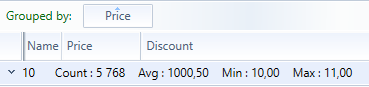 <telerik:GridViewDataColumn x:Name="NameColumn" IsReadOnly="True" Header="Name" Width="SizeToHeader" DataMemberBinding="{Binding Name}" > <telerik:GridViewDataColumn.AggregateFunctions> <telerik:CountFunction Caption="Count" ResultFormatString="{}: {0:#,0}" /> </telerik:GridViewDataColumn.AggregateFunctions> </telerik:GridViewDataColumn> <telerik:GridViewDataColumn x:Name="PriceColumn" IsReadOnly="True" Header="Price" Width="SizeToHeader" DataMemberBinding="{Binding Price}" GroupMemberPath="PriceGroup"> <telerik:GridViewDataColumn.AggregateFunctions> <telerik:AverageFunction Caption="Avg" ResultFormatString="{}: {0:D2}" /> </telerik:GridViewDataColumn.AggregateFunctions></telerik:GridViewDataColumn><telerik:GridViewDataColumn x:Name="DiscountColumn" IsReadOnly="True" Header="Discount" Width="SizeToHeader" DataMemberBinding="{Binding Discount}" GroupMemberPath="DiscountGroup"> <telerik:GridViewDataColumn.AggregateFunctions> <telerik:MinFunction Caption="Min" ResultFormatString="{}: {0:D2}" /> <telerik:MaxFunction Caption="Max" ResultFormatString="{}: {0:D2}" /> </telerik:GridViewDataColumn.AggregateFunctions> </telerik:GridViewDataColumn>