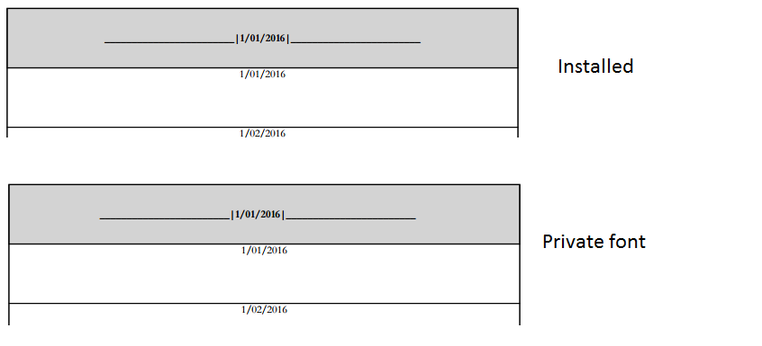 In my local testing when Garamond is installed and used natively (our current situation), the alignment of header text in tables is different to when it is used via privateFonts. I've prepared a Minimal Example (at my non-corporate github: https://github.com/Blimply/PrivateFontsMWE/tree/master) and attached a comparison screenshot of two example PDFs.