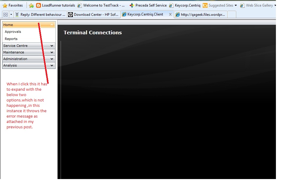 I have menu Home when I expand that it will list two items this one works good when i do manually but i use to get the following error when I try to automate using code or teststudio at this particular step i get the error.