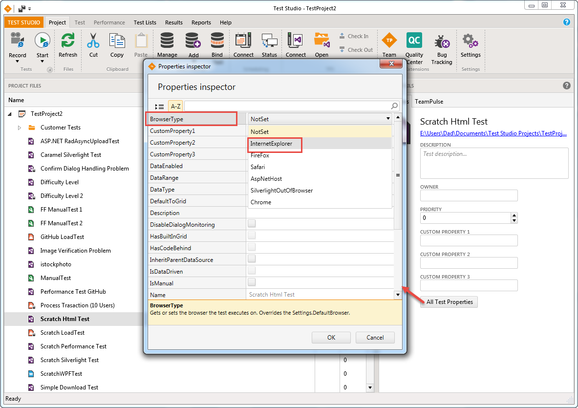 I am working with two applications, App1 that is run under any browser, and App2 that is run under Internet Explorer only. My testing generally involves entering changes through App1 and checking the results in App2. The scenario then for my test lists is test App1 under any browser, followed by testing App2 under IE. Is there a way within one test list to run one test in a selected browser and then the subsequent test in Internet Explorer only? I have tried setting the browser-type property on the second test but apparently, the browser selected at the beginning of the run overrides that property. I have also tried setting the RunsAgainst property on the second test, and then running it as a child to the first test. No success. Is there a way to do what I need to do?
