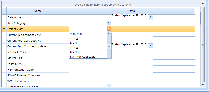 See attached image for a visual representation. The Freight Class options should only have numbers - no Yes/No or other options that you can see from the picture.