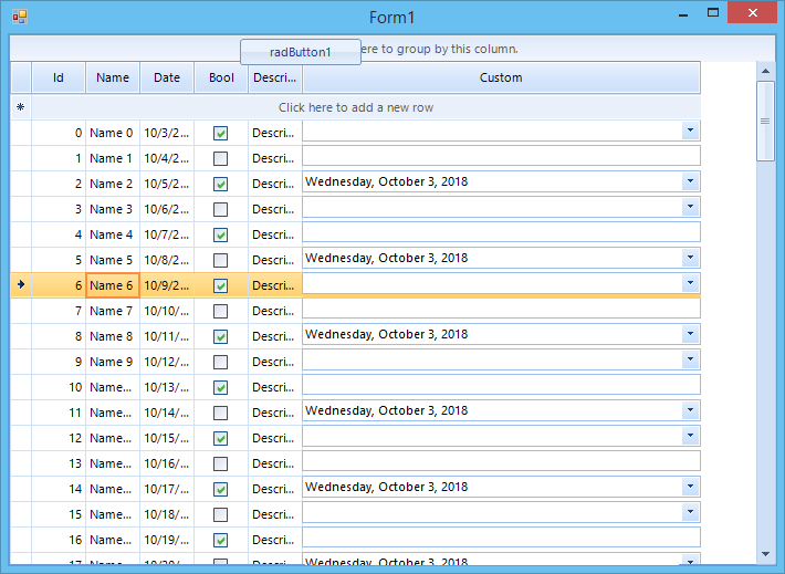 public class PNUDFCellElement : GridDataCellElement { public PNUDFCellElement(GridViewColumn column, GridRowElement row) : base(column, row) { } private StackLayoutElement stack; private RadDropDownListElement radDropDownListElement; private RadDateTimeEditorElement radDateTimeEditorElement; private RadTextBoxControlElement radTextBoxElement; protected override void CreateChildElements() { base.CreateChildElements(); stack = new StackLayoutElement(); stack.StretchHorizontally = true; stack.Orientation = Orientation.Horizontal; radDropDownListElement = new RadDropDownListElement(); radDropDownListElement.DropDownStyle = Telerik.WinControls.RadDropDownStyle.DropDownList; radDropDownListElement.StretchHorizontally = true; radDateTimeEditorElement = new RadDateTimeEditorElement(); radDateTimeEditorElement.StretchHorizontally = true; radTextBoxElement = new RadTextBoxControlElement(); radTextBoxElement.StretchHorizontally = true; stack.Children.Add(radDropDownListElement); stack.Children.Add(radDateTimeEditorElement); stack.Children.Add(radTextBoxElement); this.Children.Add(stack); } protected override void SetContentCore(object value) { this.radDropDownListElement.Visibility = Telerik.WinControls.ElementVisibility.Collapsed; this.radTextBoxElement.Visibility = Telerik.WinControls.ElementVisibility.Collapsed; this.radDateTimeEditorElement.Visibility = Telerik.WinControls.ElementVisibility.Collapsed; this.DrawText = false; if (this.RowIndex % 3 == 0) { this.radDropDownListElement.Visibility = Telerik.WinControls.ElementVisibility.Visible; this.radDropDownListElement.Text = this.Value + ""; } else if (this.RowIndex % 3 == 1) { this.radTextBoxElement.Visibility = Telerik.WinControls.ElementVisibility.Visible; this.radTextBoxElement.Text = this.Value + ""; } else { this.radDateTimeEditorElement.Visibility = Telerik.WinControls.ElementVisibility.Visible; } base.SetContentCore(value); } public class CustomDataColumn : GridViewDataColumn { public CustomDataColumn(string fieldName) : base(fieldName) { } public override Type GetCellType(GridViewRowInfo row) { if (row is GridViewDataRowInfo) { return typeof(PNUDFCellElement); } return base.GetCellType(row); } } }However, it is important to note that RadDropDownListElement, RadTextBoxElement and RadDateTimePickerElement host the MS TextBox. Using controls in grid cells may slow down the scrolling and will cause visual glitches as they do not support clipping. This is the result you obtained in the screenshot. Instead of using RadTextBoxElement, feel free to use a RadTextBoxControlElement which doesn't host the MS TextBox. For the RadDropDownListElement, you can set the DropDownStyle property to DropDownList. Thus, the hosted MS TextBox will be hidden and you will be able to select the items from the drop down only. As to the RadDateTimePickerElement, there is not suitable mode that I can suggest in order to hide the hosted TextBox. A better option would be using custom editors. Thus, you can construct the desired editor and activate it for the respective cell.