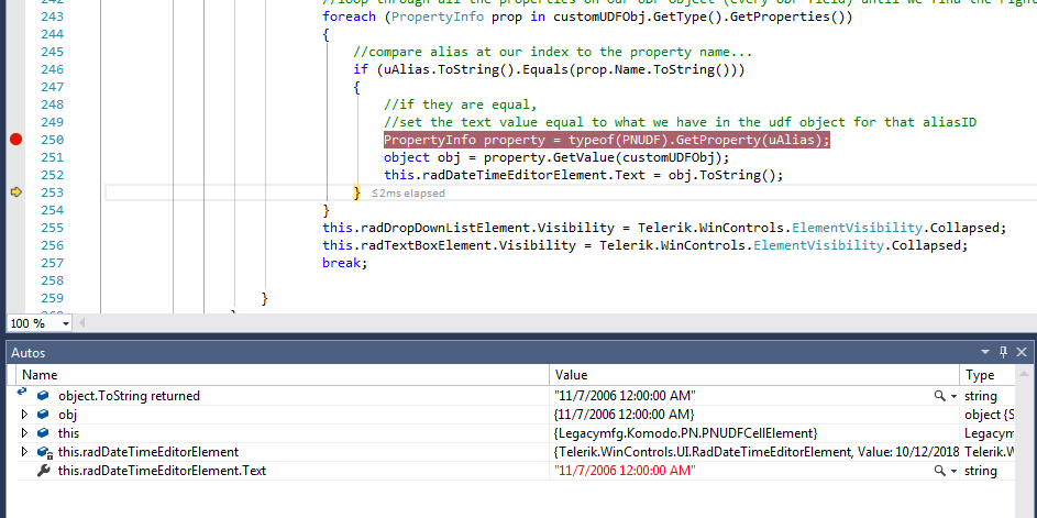 uAlias = "U_" + aliasID[index].ToString(); //loop through all the properties on our UDF Object (every UDF field) until we find the right one foreach (PropertyInfo prop in customUDFObj.GetType().GetProperties()) { //compare alias at our index to the property name... if (uAlias.ToString().Equals(prop.Name.ToString())) { //if they are equal, //set the text value equal to what we have in the udf object for that aliasID PropertyInfo property = typeof(PNUDF).GetProperty(uAlias); object obj = property.GetValue(customUDFObj); this.radDateTimeEditorElement.Text = obj.ToString(); } }
