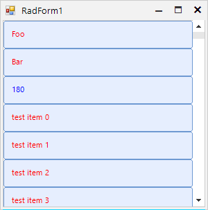 001.internal class NotificationA : INotification {002. public string Name { get; set; }003. public string Type => nameof(NotificationA);004.}005. 006.internal class NotificationB : INotification {007. public int Degree { get; set; }008. public string Type => nameof(NotificationB);009.}010. 011.internal class NotificationAListItem : RadListVisualItem {012. private LightVisualElement notificationTitleElement;013. private StackLayoutPanel stackLayout;014. 015. protected override void CreateChildElements()016. {017. base.CreateChildElements();018. 019. stackLayout = new StackLayoutPanel();020. stackLayout.Orientation = System.Windows.Forms.Orientation.Vertical;021. 022. notificationTitleElement = new LightVisualElement();023. notificationTitleElement.TextAlignment = ContentAlignment.MiddleLeft;024. notificationTitleElement.Margin = new Padding(10);025. notificationTitleElement.ForeColor = Color.Black;026. stackLayout.Children.Add(notificationTitleElement);027. 028. this.Children.Add(stackLayout);029. }030. 031. public override void Synchronize()032. {033. base.Synchronize();034. Text = string.Empty;035. if (Data.DataBoundItem is not NotificationA n) return;036. notificationTitleElement.Text = Convert.ToString(n.Name);037. }038. }039. 040.internal class NotificationBListItem : RadListVisualItem041. {042. private LightVisualElement notificationTitleElement;043. private StackLayoutPanel stackLayout;044. 045. protected override void CreateChildElements()046. {047. base.CreateChildElements();048. 049. stackLayout = new StackLayoutPanel();050. stackLayout.Orientation = Orientation.Vertical;051. 052. 053. notificationTitleElement = new LightVisualElement();054. notificationTitleElement.TextAlignment = ContentAlignment.MiddleLeft;055. notificationTitleElement.Margin = new Padding(10);056. notificationTitleElement.ForeColor = Color.Black;057. stackLayout.Children.Add(notificationTitleElement);058. 059. Children.Add(stackLayout);060. 061. Padding = new Padding(5);062. Shape = new RoundRectShape(3);063. BorderColor = Color.FromArgb(255, 110, 153, 210);064. BorderGradientStyle = GradientStyles.Solid;065. DrawBorder = true;066. DrawFill = true;067. BackColor = Color.FromArgb(255, 230, 238, 254);068. GradientStyle = GradientStyles.Solid;069. }070. 071. public override void Synchronize()072. {073. base.Synchronize();074. Text = string.Empty;075. if (Data.DataBoundItem is not NotificationB n) return;076. notificationTitleElement.Text = Convert.ToString(n.Degree);077. }078.}079. 080.public partial class TestForm : RadForm {081. public TestForm() {082. InitializeComponent();083. InitializeViewAppearance();084. }085. 086. private void InitializeViewAppearance() {087. var notifications = new List<INotification> {088. new NotificationA {Name = "Foo"},089. new NotificationA {Name = "Bar"},090. new NotificationB { Degree = 180 }091. };092. for (var i = 0; i < 100000; i++) {093. notifications.Add(new NotificationA { Name = $"test item {i}" });094. }095. lcNotifications.CreatingVisualListItem += OnNotificationItemCreating;096. lcNotifications.DataSource = notifications;097. }098. 099. private void OnNotificationItemCreating(object sender, CreatingVisualListItemEventArgs args)100. {101. args.VisualItem = args.DataItem.DataBoundItem switch {102. NotificationA _ => new NotificationAListItem(),103. NotificationB _ => new NotificationBListItem(),104. _ => args.VisualItem105. };106. }107. }