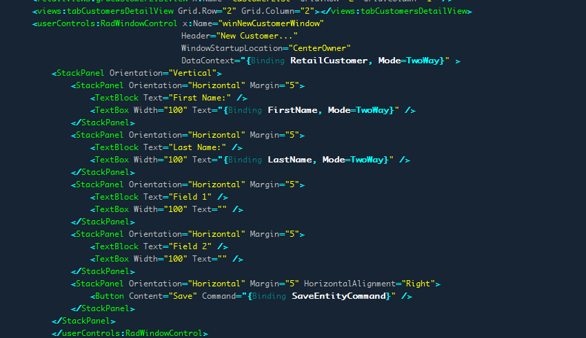 <Grid x:Name="LayoutRoot" Background="{StaticResource AppBackgroundBrush}"> <telerikNavigation:RadWindow x:Name="ValidationErrorWindow" Header="{Binding ResourceTitleValidationErrors}"> <StackPanel> <ItemsControl ItemsSource="{Binding ValidationErrors}"> <ItemsControl.ItemTemplate> <DataTemplate> <StackPanel> <TextBlock Text="{Binding ErrorContent}" /> <Rectangle Style="{StaticResource SmallSpacerStyle}" /> </StackPanel> </DataTemplate> </ItemsControl.ItemTemplate> </ItemsControl> <Rectangle Style="{StaticResource StandardSpacerStyle}" /> <Button Content="{Binding ResourceCommandOK}" Command="{Binding CloseValidationWindowCommand}" HorizontalAlignment="Left" TabIndex="0" /> </StackPanel> </telerikNavigation:RadWindow> Partial Public Class MainPage Public Sub New() InitializeComponent() 'Me.loginContainer.Child = New LoginStatus() AddHandler Loaded, AddressOf OnLoaded End Sub Private Sub OnLoaded(ByVal sender As Object, ByVal e As RoutedEventArgs) CompositionInitializer.SatisfyImports(Me) DataContext = ViewModel AddHandler ViewModel.ConfirmDeletion, AddressOf OnConfirmDeletion AddHandler ViewModel.CloseConfirmDeletionWindow, AddressOf OnCloseConfirmDeletionWindow I am currently totally stymied by this and need help to resolve the issue.