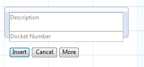 <InlineInsertTemplate> <div> <div> <telerik:RadTextBox ID="TitleTextBox" runat="server" Text='<%# Bind("Description") %>' TextMode="MultiLine" Rows="2" EmptyMessage="Description" MaxLength="240" Width="100%"> </telerik:RadTextBox> <telerik:RadTextBox ID="DocketNo" runat="server" Width="100%" EmptyMessage="Docket Number" MaxLength="15" Text='<%# Bind("DocketNo") %>'> </telerik:RadTextBox> </div> <div style="padding-top:10px;"> <asp:Button ID="btnSave" runat="server" CommandName="Insert" Text="Insert" /> <asp:Button ID="btnCancel" runat="server" CommandName="Cancel" Text="Cancel" /> <asp:Button ID="btnOptions" runat="server" CommandName="More" Text="More" /> </div> </div></InlineInsertTemplate>See attached image.