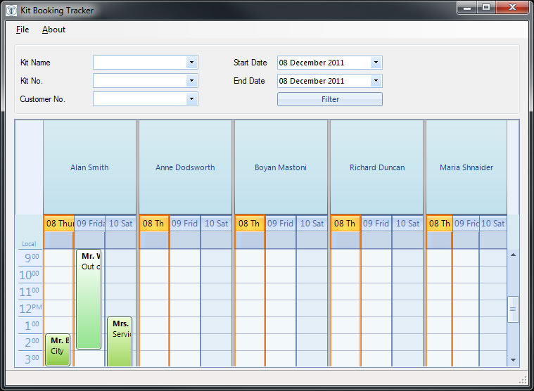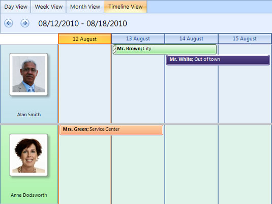 Schedule.ActiveViewType = Telerik.WinControls.UI.SchedulerViewType.Timeline; Schedule.GetTimelineView().ResourcesPerView = 8; Schedule.GroupType = GroupType.Resource; SchedulerDayViewGroupedByResourceElement headerElement = Schedule.SchedulerElement.ViewElement as SchedulerDayViewGroupedByResourceElement; Resource resource; resource = new Resource(); resource.Id = new EventId("AC00-1"); resource.Name = "AC00-1"; resource.Color = Color.Beige; Schedule.Resources.Add(resource); resource = new Resource(); resource.Id = new EventId("AC00-2"); resource.Name = "AC00-2"; resource.Color = Color.PowderBlue; Schedule.Resources.Add(resource); resource = new Resource(); resource.Id = new EventId("AC00-3"); resource.Name = "AC00-3"; resource.Color = Color.PowderBlue; Schedule.Resources.Add(resource); Schedule.Appointments.BeginUpdate(); Appointment appointment; appointment = new Appointment(new DateTime(2011, 12, 07, 12, 00, 00), new DateTime(2011, 12, 09, 12, 00, 00), "Summary", "Descriptions", "Location"); appointment.ResourceId = this.Schedule.Resources[0].Id; appointment.BackgroundId = (int)AppointmentBackground.Important; appointment.ToolTipText = "This is my custom Tooltip"; Schedule.Appointments.Add(appointment);