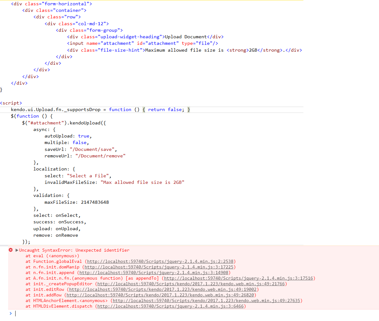 In this saga I found this thread http://www.telerik.com/forums/disable-drag-drop#2293863 and tried to use this line 'kendo.ui.Upload.fn._supportsDrop = function() { return false; }' exactly as stated in the thread. But it never worked and resulted with a javascript error on my console window. Please see the attached screenshot for the error and my code snippet.