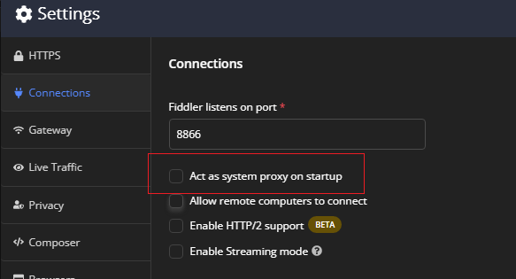 Unchecking the option will cause Fiddler not to be automatically set as a system proxy on each application startup.