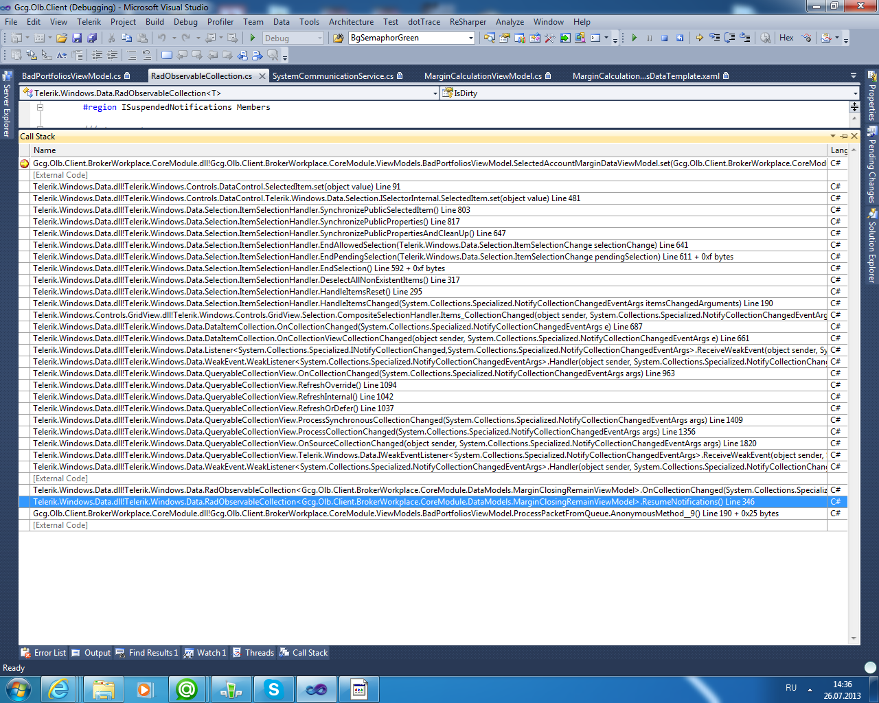 Hello, no it don't work. I use RadObservableCollection and QueryableCollectionView. GridView bind to the QueryableCollectionView. When I need remove, add or edit item I call RadObservableCollection.SuspendNotification(). After editing items I call RadObservableCollection.ResumeNotification(). And after gridView sometimes try to set selectedItem to null (2 times). I attached call stack.