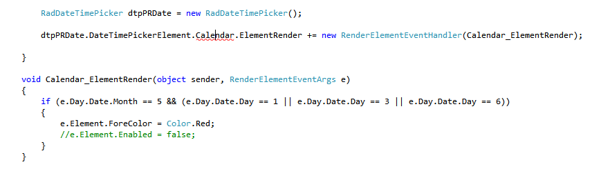 void Calendar_ElementRender(object sender, RenderElementEventArgs e){ if (e.Day.Date.Month == 5 && (e.Day.Date.Day == 1 || e.Day.Date.Day == 3 || e.Day.Date.Day == 6)) { e.Element.ForeColor = Color.Red; //e.Element.Enabled = false; }}I hope this helps.