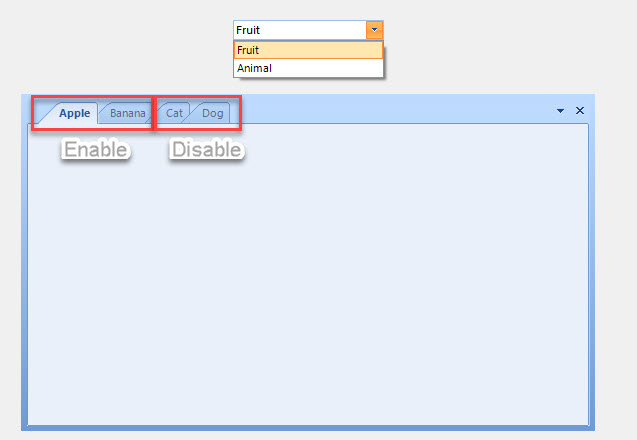 Like attach file, I have a DropDownList, when I choose [Fruit], I just want to show tab which is Fruit (Apple and Banana) and disabled another animal tabs.
