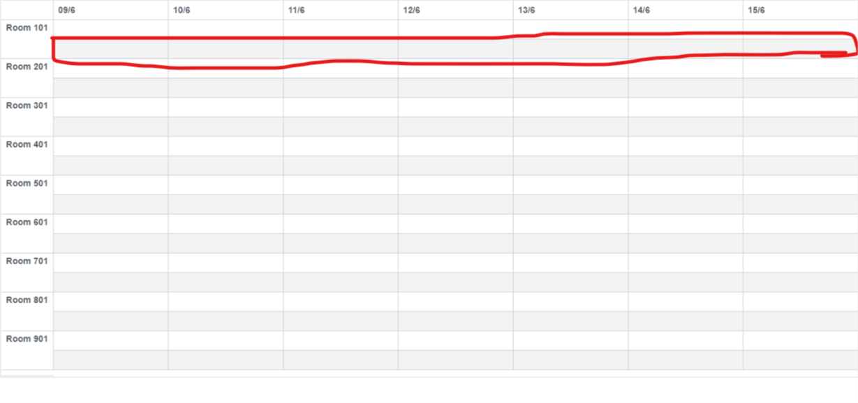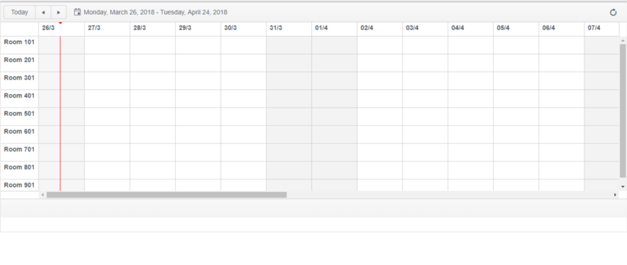 $scope.schedulerOptions = { eventHeight: 20, majorTick: 1440,//set major tick to full day and leave the default startTime/endTime minorTickCount: 1,//show only one minor tick majorTimeHeaderTemplate: "", ShowTimeRuler :false, timeSlot:false, editable: { template: $("#customEditorTemplate").html() }, date: new Date("2013/6/13"), startTime: new Date("2013/6/13 07:00 AM"), height: 600, views: [ { type: "week", selected: true , dateHeaderTemplate: "<span class='k-link k-nav-day'>#=kendo.toString(date, ' dd/M')#</span>" } ], timezone: "Etc/UTC", dataSource: { batch: true, transport: { read: { dataType: "jsonp" }, update: { dataType: "jsonp" }, create: { dataType: "jsonp" }, destroy: { dataType: "jsonp" }, parameterMap: function(options, operation) { if (operation !== "read" && options.models) { return {models: kendo.stringify(options.models)}; } } }, schema: { model: { id: "taskId", fields: { taskId: { from: "TaskID", type: "number" }, title: { from: "Title", defaultValue: "No title", validation: { required: true } }, start: { type: "date", from: "Start" }, end: { type: "date", from: "End" }, startTimezone: { from: "StartTimezone" }, endTimezone: { from: "EndTimezone" }, description: { from: "Description" }, recurrenceId: { from: "RecurrenceID" }, recurrenceRule: { from: "RecurrenceRule" }, recurrenceException: { from: "RecurrenceException" }, ownerId: { from: "OwnerID", defaultValue: 1 }, isAllDay: { type: "boolean", from: "IsAllDay" } } } }, filter: { logic: "or", filters: [ { field: "ownerId", operator: "eq", value: 1 }, { field: "ownerId", operator: "eq", value: 2 } ] } }, dataBound: function(e) { //hide the times row from the date/time header: var view = this.view(); view.datesHeader.find("tr:last").prev().hide(); view.timesHeader.find("tr:last").prev().hide(); //Required: remove only last table in dataBound when grouped var tables = $(".k-scheduler-times .k-scheduler-table"); tables = tables.last(); var rows = tables.find("tr"); rows.each(function() { $(this).children("th:last").hide(); }); }, group: { resources: ["Rooms"], orientation: "vertical" }, resources: [ { field: "roomId", name: "Rooms", dataSource: [ { text: "Room 101", value: 1, color: "#6eb3fa" }, { text: "Room 201", value: 2, color: "#f58a8a" }, { text: "Room 301", value: 3, color: "#2c0eca" }, { text: "Room 401", value: 4, color: "#ed8312" }, { text: "Room 501", value: 5, color: "#2cdeca" }, { text: "Room 601", value: 6, color: "#c3ff42" }, { text: "Room 701", value: 7, color: "#3aeeca" }, { text: "Room 801", value: 8, color: "#21d187" }, { text: "Room 901", value: 9, color: "#5371a0" }, ], title: "Room" }, { field: "ownerId", title: "Owner", dataSource: [ { text: "Alex", value: 1, color: "#f8a398" }, { text: "Bob", value: 2, color: "#51a0ed" }, { text: "Charlie", value: 3, color: "#56ca85" } ] } ] };