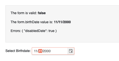Note that Saturdays and Sundays are disabled, and cannot be chosen from the Calendar, but can be entered as dates in the input. When this is done, the whole form control becomes invalid, and the respective error is printed in the box on the top: