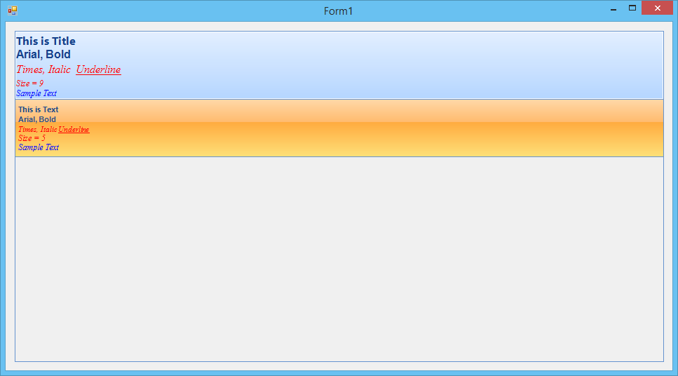 this.radPageViewPage1.Text = "<html><size=8>This is Text <br><b><font=Arial>Arial, Bold</b><br><i><color= Red><font=Times New Roman>Times, Italic <u>Underline</u><br><size=9>Size = 5<br><color= 0, 0, 255>Sample Text";