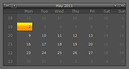 | <Calendar DayNameFormat="FirstTwoLetters" FirstDayOfWeek="Monday" runat="server" OnDayRender="Calendar_OnDayRender" Skin="Office2007" DisabledDayStyle-ForeColor="Gray"> |