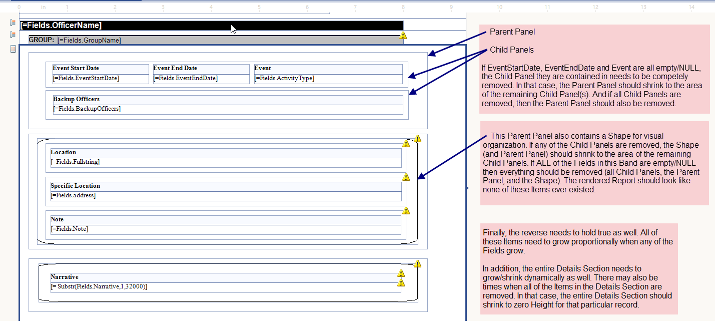 I have a Panel. Inside the Panel is a Shape. Inside the Shape are some TextBoxes. I am using the Shape to frame some TextBoxes (for visual organization). The Panel grows with the TextBoxes, but the Shape does not. So on some records, some of the data in the TextBoxes bleeds over the Shape.