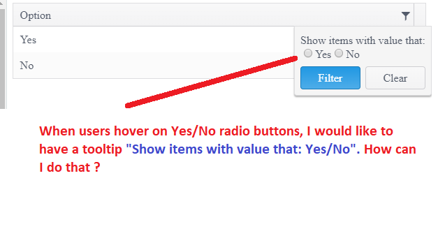 When users hover on Yes/No radio buttons, I would like to have a tooltip "Show items with value that: Yes (if users hover Yes button) or No (if users hover No button)". How can I do that ? Please refer the attachment for more details and give me your suggestions. Thanks.
