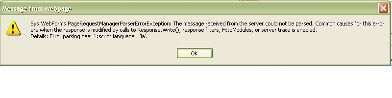 Sys.WebForms.PageRequestManagerParserErrorException. the message received from server could not be parsed. Common causes for this error are when the response is modified by call to response.write()...