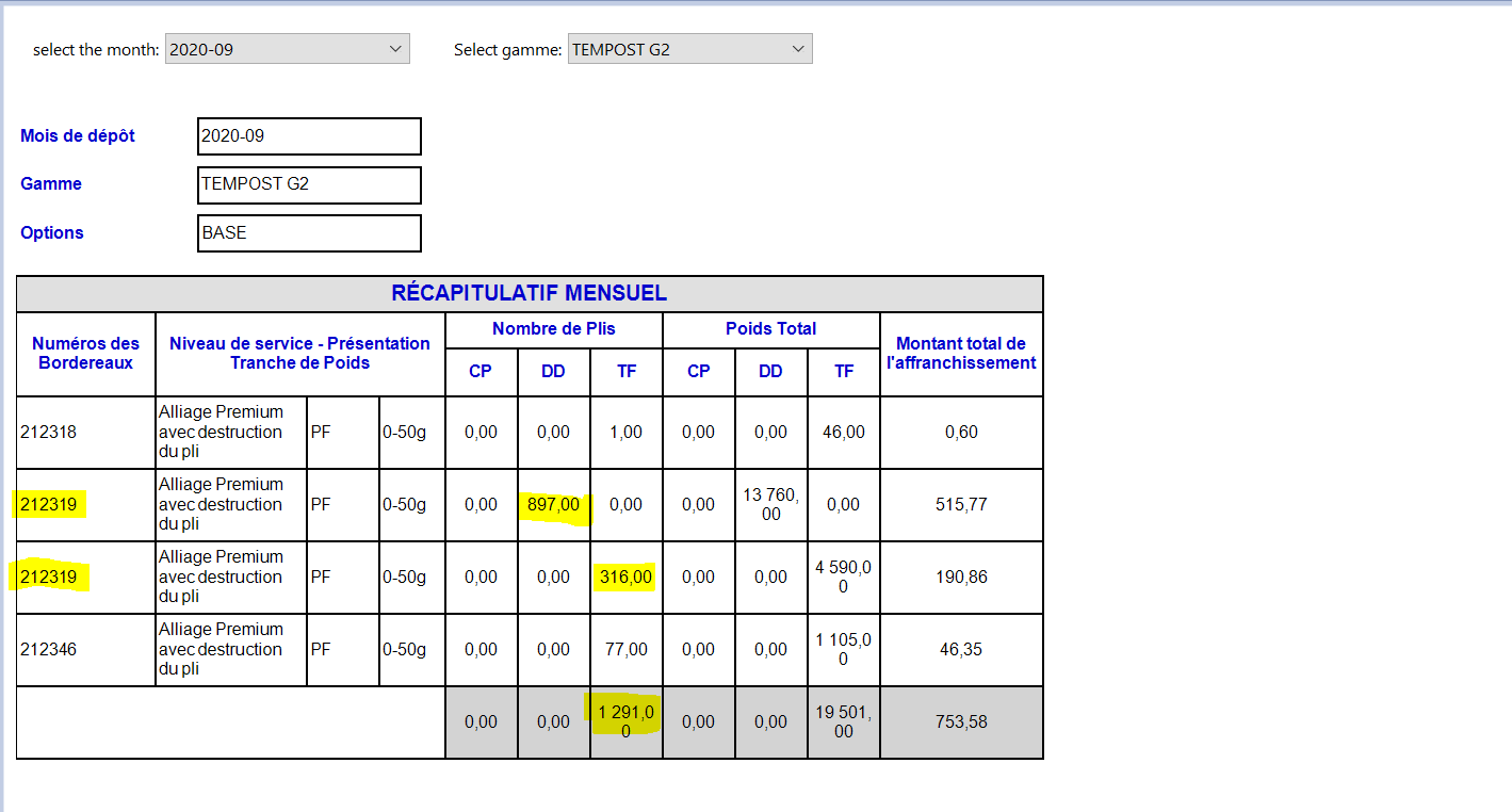 it shows me the total of "Nombre de Plis" in just "DD" column (1 233) while it should appears to display (897 in "DD" and 316 in "TF") as the capture that I have attached. Same problem in "Poids Total"