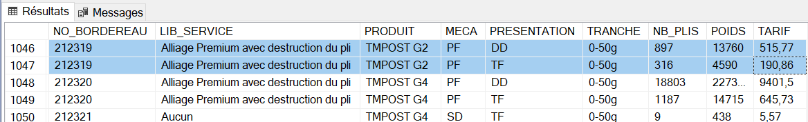 The concern is that I cannot change the data like you did, because I get the data by executing an sql query and moreover I don't have a static NO_BORDEREAU (I have attached a screenshot ) on which I can test, there are quite a few elements which have Nb_Plis/Poids with presentation types (CP, DD, TF)