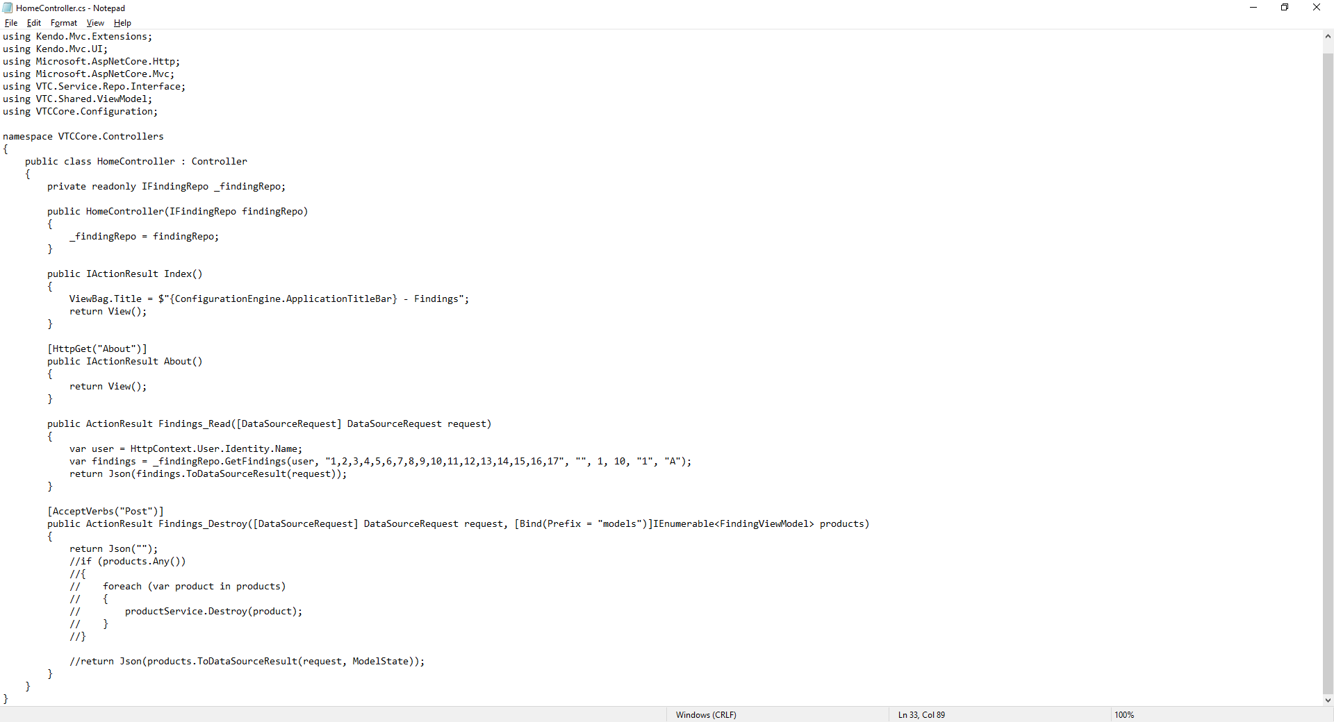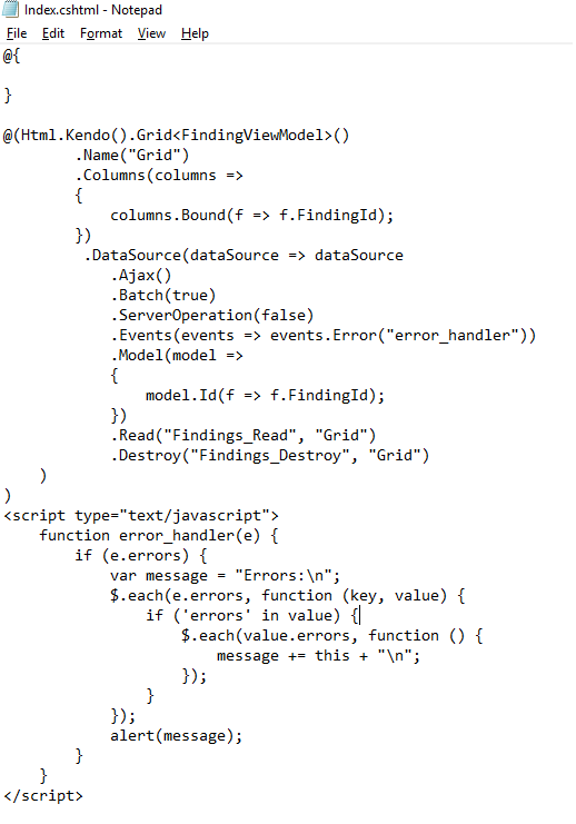 I am assuming that the Findings_Read([DataSourceRequest] DataSourceRequest request) will be called upon loading. However, it is not called at all. This is not the case when running the Telerik Trial Examples.