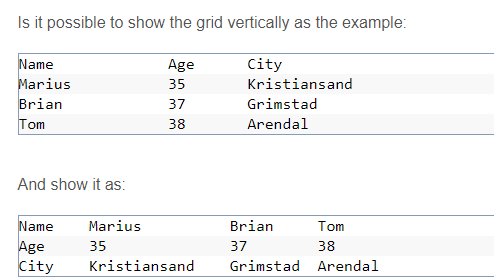 I need a feature to implement to transpose a grid (i.e. displaying tabular data in the flip axis so rows becomes columns and vice versa).