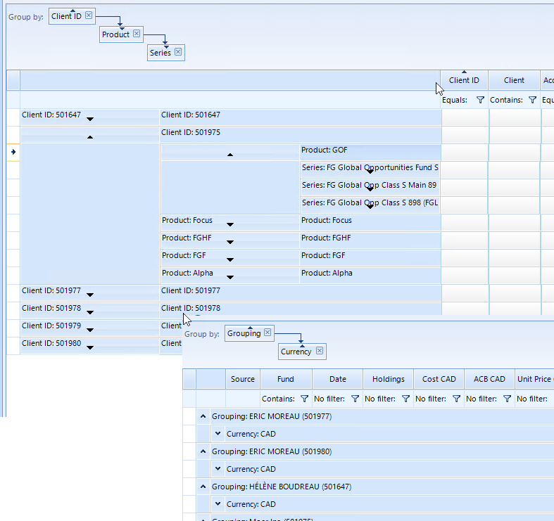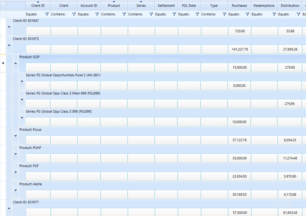 What I would like is to see the sum under the columns Purchases, Redemptions, Distribution, ... to show up on the same line as the grouped row (Client ID: XX, Product: YY, Series: ZZ).