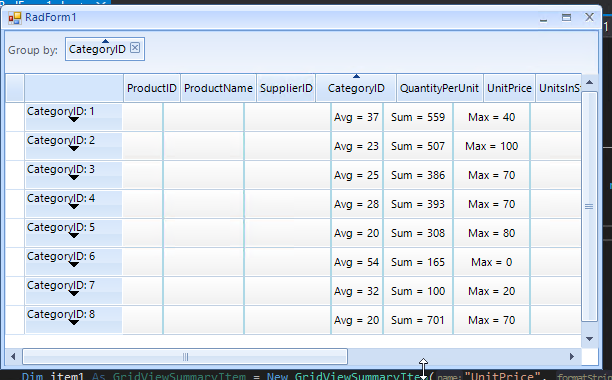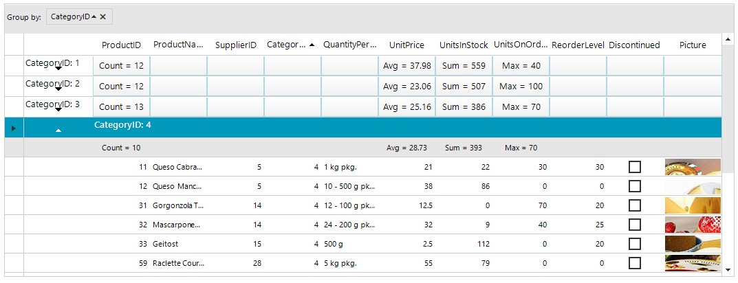 Note that the summary values in the collapsed state of the group row are aligned with the column headers. If the summary values are displayed in the same line as the group header, the group header text and the summary values will be overlapped.