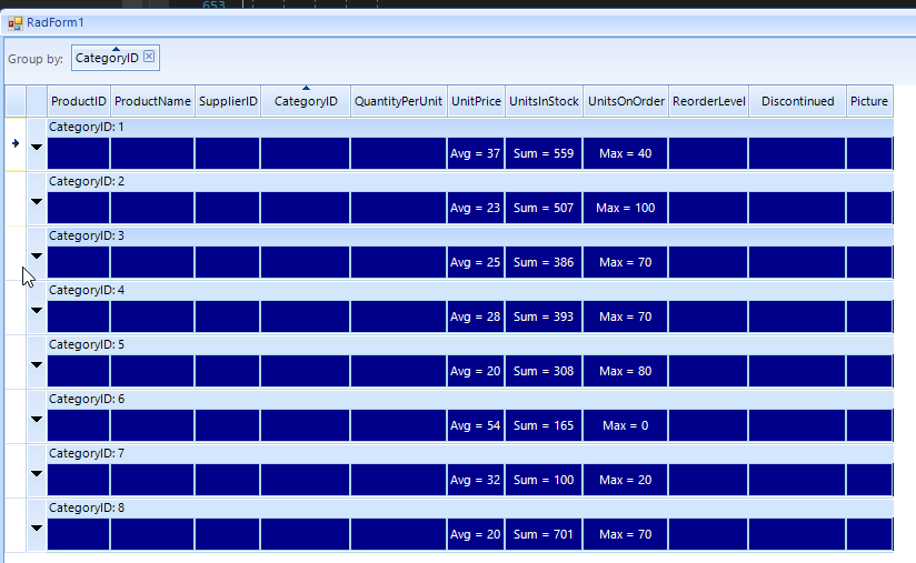 this.radGridView1.TableElement.GroupHeaderHeight = 30; public RadForm1()