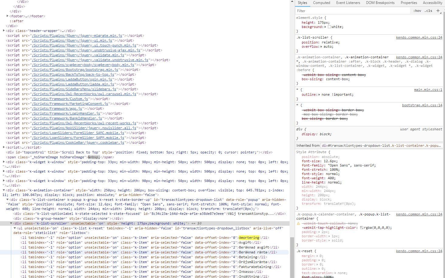 I noticed that the content of the dropdown is present as an ul at the end of the html document and if I set background = white in the console then it works. However, I do not understand how to affect that one from where I create the kendo dropdown.