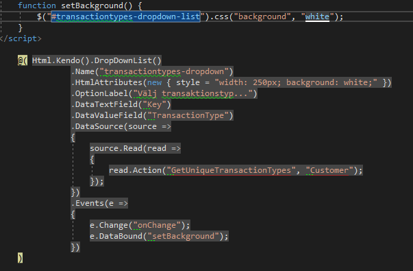 I have a dropdown list within a tab strip which in some way has a transparent background. The actual control is in front of the grid behind because if I click on the dropdown items they react and everything works correct but I am trying to get the dropdown to not be transparent.