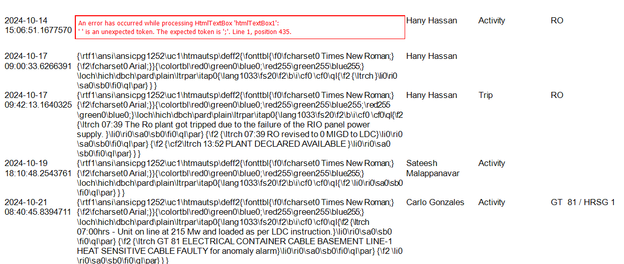 INSERT [dbo].[RTF_Sample] ([LogbookName], [Name], [EntryText], [EntryDateTime]) VALUES (N'Shift Log Power ', N'Day Shift', N'{\rtf1\ansi\ansicpg1252\uc1\htmautsp\deff2{\fonttbl{\f0\fcharset0 Times New Roman;}{\f2\fcharset0 Arial;}}{\colortbl\red0\green0\blue0;\red255\green255\blue255;}\loch\hich\dbch\pard\plain\ltrpar\itap0{\lang1033\fs20\f2\b\i\cf0 \cf0\ql{\f2 {\ltrch 7:00 UNIT ON T/G OPERATION. }\li0\ri0\sa0\sb0\fi0\ql\par}