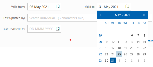 At the start, when I select a date from the first RadDatePicker (valid from), the other one is working correctly (see the ok.png). But if I choose another date (minor to the previous one) some date are still greyed out on the second control (Valid To, see the not_ok.png --> the date 1,2,3,4,5 cannot be selected). I'm not able to reproduce the same error on the other side, changing the valid to control.