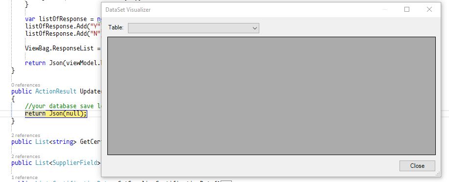 @using Kendo.Mvc.UI@model System.Data.DataTable@(Html.Kendo().Grid<dynamic>() .Name("Grid") .Columns(columns => { foreach (System.Data.DataColumn column in Model.Columns) { if (column.ColumnName != "SupplierNumber" && column.ColumnName != "CustomerItemNumber") { columns.Bound(column.ColumnName).ClientTemplate("<input type='checkbox' disabled #= ColumnName == 'True' ? checked='checked' : '' # />"); } else { columns.Bound(column.ColumnName); } } columns.Command(cmd => cmd.Edit()); }) .Pageable() .Sortable() .Editable(ed => ed.Mode(GridEditMode.PopUp)) .Filterable() .Groupable() .DataSource(dataSource => dataSource .Ajax() .Model(model => { var id = Model.PrimaryKey[0].ColumnName; model.Id(id); foreach (System.Data.DataColumn column in Model.Columns) { var field = model.Field(column.ColumnName, column.DataType); if (column.ColumnName == id) { field.Editable(false); } } }) .Read(read => read.Action("Read", "Home")) .Update(update => update.Action("Update", "Home")) ))