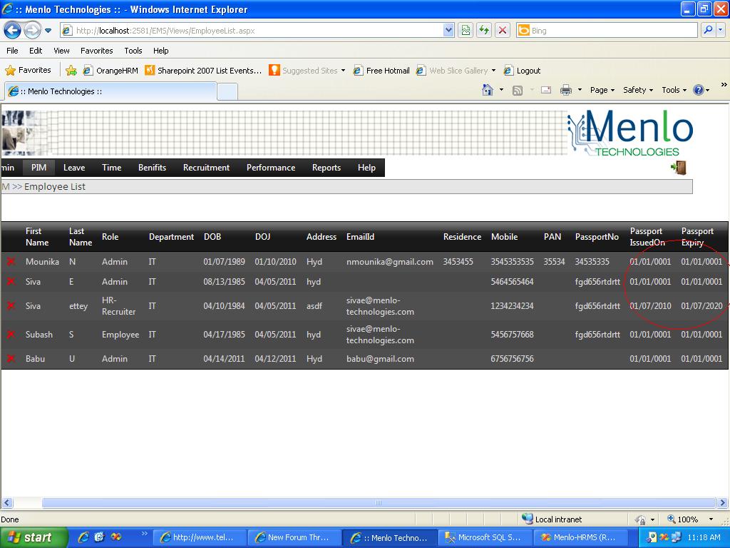 <%@ Page Language="C#" MasterPageFile="~/sample.Master" AutoEventWireup="true" CodeBehind="EmployeeList.aspx.cs" Inherits="MenloHRMS.Views.EmployeeList" %> <%--<%@ Register Assembly="BasicFrame.WebControls.BasicDatePicker" Namespace="BasicFrame.WebControls" TagPrefix="BDP" %>--%> <%@ Register TagPrefix="telerik" Namespace="Telerik.Web.UI" Assembly="Telerik.Web.UI" %> <asp:Content ID="Content2" runat="server" ContentPlaceHolderID="ContentPlaceHolder1"> <br /> <br /> <style type="text/css"> .MyImageButton { cursor: hand; } .EditFormHeader td { font-size: 14px; padding: 4px !important; color: #0066cc; } </style> <script type="text/javascript" language="javascript"> function AllowNumeric() { // Get the ASCII value of the key that the user entered var key =window.event.keyCode; // Verify if the key entered was a numeric character (0-9) or a decimal (.) if ( (key > 47 && key < 58) || key == 46 ) // If it was, then allow the entry to continue return; else // If it was not, then dispose the key and continue with entry window.event.returnValue = null; } </script> <telerik:RadAjaxManager runat="server" ID="RadAjaxManager1" DefaultLoadingPanelID="RadAjaxLoadingPanel1"> <AjaxSettings> <telerik:AjaxSetting AjaxControlID="rgEmployeeLst"> <UpdatedControls> <telerik:AjaxUpdatedControl ControlID="rgEmployeeLst" /> <telerik:AjaxUpdatedControl ControlID="RadInputManager1" /> </UpdatedControls> </telerik:AjaxSetting> </AjaxSettings> </telerik:RadAjaxManager> <telerik:RadGrid ID="rgEmployeeLst" runat="server" GridLines="None" Skin="Black" DataSourceID="dsEmployees" AllowAutomaticDeletes="True" AllowSorting="false" AllowAutomaticUpdates="True" AutoGenerateColumns="False"> <HeaderContextMenu CssClass="GridContextMenu GridContextMenu_Default"> </HeaderContextMenu> <MasterTableView DataSourceID="dsEmployees" AllowPaging="true" PageSize="10" DataKeyNames="EmpId"> <EditFormSettings EditFormType="Template"> <EditColumn UniqueName="EditCommandColumn1"> </EditColumn> <FormTemplate> <table cellspacing="2" cellpadding="1" width="100%" border="0"> <tr> <td class="lblCaption" align="right"> FirstName<span class="MandatoryField">*</span>: </td> <td> <asp:TextBox Width="200px" ID="txtFName" runat="server" Text='<%# Bind("FName") %>'></asp:TextBox> </td> <td class="lblCaption" align="right"> Last Name<span class="MandatoryField">*</span>: </td> <td> <asp:TextBox ID="txtLName" runat="server" Width="200px" MaxLength="30" Text='<%# Bind("LName") %>'></asp:TextBox> </td> </tr> <tr> <td align="right" class="lblCaption"> Role<span class="MandatoryField">*</span>: </td> <td> <telerik:RadComboBox ID="cmbRole" Width="205px" runat="server" DataSourceID="DsRoles" SelectedValue='<%# Bind("RoleID") %>' DataTextField="Role" DataValueField="RoleId"> </telerik:RadComboBox> </td> <td align="right" class="lblCaption"> Department<span class="MandatoryField">*</span>: </td> <td> <telerik:RadComboBox ID="cmbDept" Width="205px" runat="server" DataSourceID="DSDepts" DataTextField="DeptName" DataValueField="DeptID" SelectedValue='<%# Bind("DeptID") %>'> </telerik:RadComboBox> </td> </tr> <tr> <td align="right" class="lblCaption"> Date Of Birth<span class="MandatoryField">*</span>: </td> <td> <%--<BDP:BasicDatePicker ID="dtpkrDOB" runat="server" Width="200px" SelectedDate='<%# Bind("DOB") %>'> </BDP:BasicDatePicker>--%> <telerik:RadDatePicker ID="dtpkrDOB" runat="server" Width="230px" ValidationGroup="Validate" ShowPopupOnFocus="True" SelectedDate='<%# Bind("DOB") %>'> <Calendar ID="Calendar1" UseColumnHeadersAsSelectors="False" runat="server" UseRowHeadersAsSelectors="False" ViewSelectorText="x"> </Calendar> <DatePopupButton HoverImageUrl="" ImageUrl="" /> <DateInput ID="DateInput1" DateFormat="M/d/yyyy" runat="server"> </DateInput> </telerik:RadDatePicker> <asp:RequiredFieldValidator ID="RFVDOB" runat="server" ControlToValidate="dtpkrDOB" ErrorMessage="*" ToolTip="Enter DateOfBirth"></asp:RequiredFieldValidator> </td> <td align="right" class="lblCaption"> Date Of Joining<span class="MandatoryField">*</span>: </td> <td> <%--<BDP:BasicDatePicker ID="dtpkrDOJ" runat="server" Width="200px" SelectedDate='<%# Bind("DOJ") %>'> </BDP:BasicDatePicker>--%> <telerik:RadDatePicker ID="dtpkrDOJ" runat="server" Width="230px" ValidationGroup="Validate" ShowPopupOnFocus="True" SelectedDate='<%# Bind("DOJ") %>'> <Calendar ID="Calendar2" UseColumnHeadersAsSelectors="False" runat="server" UseRowHeadersAsSelectors="False" ViewSelectorText="x"> </Calendar> <DatePopupButton HoverImageUrl="" ImageUrl="" /> <DateInput ID="DateInput2" DateFormat="M/d/yyyy" runat="server" DisplayDateFormat="M/d/yyyy"> </DateInput> </telerik:RadDatePicker> <asp:RequiredFieldValidator ID="RFVDOJ" runat="server" ControlToValidate="dtpkrDOJ" ErrorMessage="*" ToolTip="Enter DateOfJoining"></asp:RequiredFieldValidator> </td> </tr> <tr> <td align="right" class="lblCaption"> Address<span class="MandatoryField">*</span>: </td> <td> <asp:TextBox ID="txtAddress" runat="server" Width="200px" TextMode="MultiLine" Text='<%# Bind("Address") %>'></asp:TextBox> </td> <td align="right" class="lblCaption"> Phone(Res): </td> <td> <asp:TextBox ID="txtResi" runat="server" Width="200px" MaxLength="10" Text='<%# Bind("Phone_Resi") %>' onkeypress="AllowNumeric()"> </asp:TextBox> </td> </tr> <tr> <td align="right" class="lblCaption"> Phone(Mobile)<span class="MandatoryField">*</span>: </td> <td> <asp:TextBox ID="txtMobile" runat="server" Width="200px" MaxLength="10" Text='<%# Bind("Phone_Mobile") %>' onkeypress="AllowNumeric()"> </asp:TextBox> </td> <td align="right" class="lblCaption"> PANCard: </td> <td> <telerik:RadTextBox ID="txtPanCard" runat="server" Width="200px" Text='<%# Bind("PAN") %>'> </telerik:RadTextBox> </td> </tr> <tr> <td align="right" class="lblCaption"> PassportNo: </td> <td> <telerik:RadTextBox ID="txtPassport" runat="server" Width="200px" Text='<%# Bind("PassportNo") %>'> </telerik:RadTextBox> </td> <td class="lblCaption" align="right"> Passport Issue Date: </td> <td> <%--<BDP:BasicDatePicker 