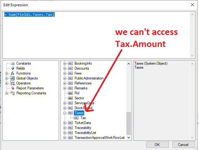 It seems that the expression editor and Data Source configurator is not able to reach the depth level of Product.Taxes.Tax.Amount. We tried to acces via JSON Path in the Data Source but didn't work