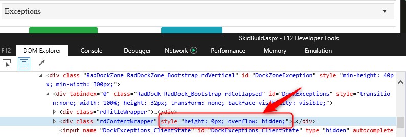 <telerik:RadDockLayout runat="server" ID="DockLayoutExceptions"> <telerik:RadDockZone runat="server" ID="DockZoneException" Orientation="Vertical" MinHeight="40px" MinWidth="300px"> <telerik:RadDock RenderMode="Lightweight" runat="server" ID="DockExceptions" Title="Exceptions" EnableDrag="False" DockMode="Docked" Collapsed="True"> <Commands> <telerik:DockExpandCollapseCommand /> </Commands> <ContentTemplate> <cust:ExceptionTable runat="server" ID="tblOrderExceptions" Type="Order" /> </ContentTemplate> </telerik:RadDock> </telerik:RadDockZone></telerik:RadDockLayout>